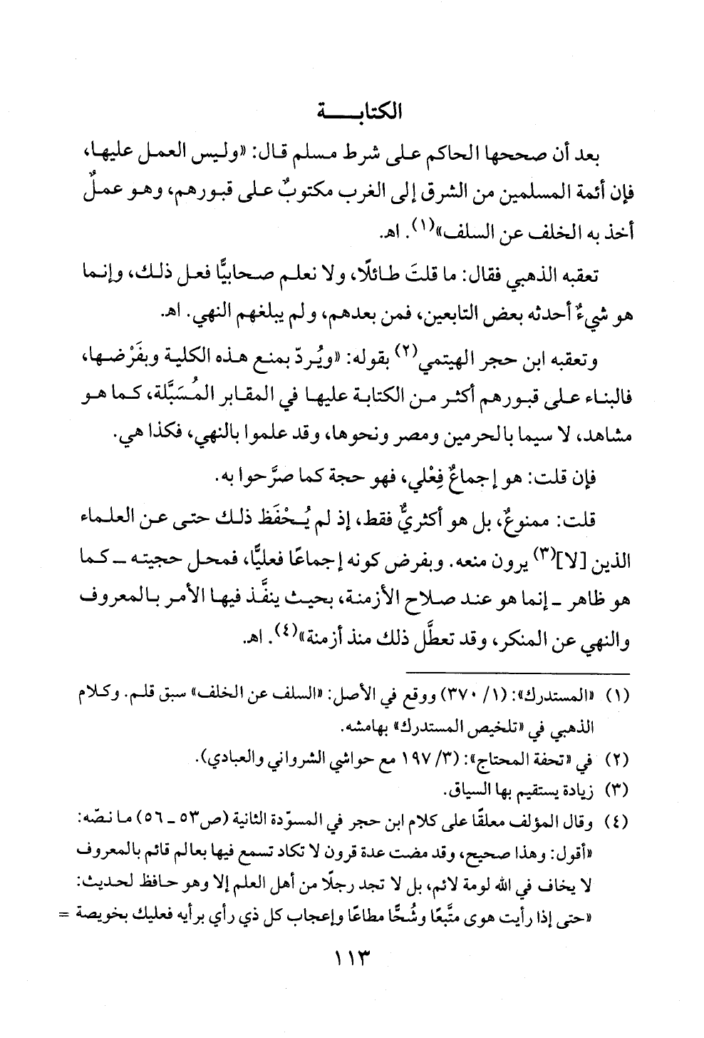 وتعقبه ابن حجر الهيتمي (¬٢) بقوله: "ويُردّ بمنع هذه الكلية وبفَرْضها، فالبناء على قبورهم أكثر من الكتابة عليها في المقابر المُسَبَّلة، كما هو مشاهد، لا سيما بالحرمين ومصر ونحوها، وقد علموا بالنهي، فكذا هي.