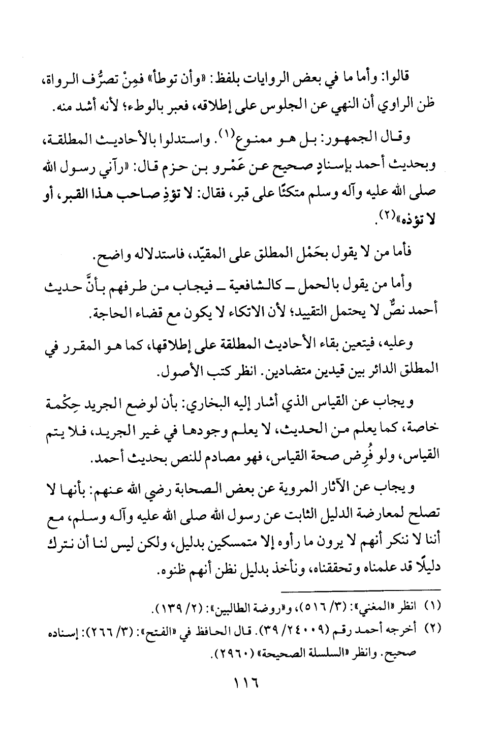 وقال الجمهور: بل هو ممنوع (¬١). واستدلوا بالأحاديث المطلقة، وبحديث أحمد بإسنادٍ صحيح عن عَمْرو بن حزم قال: "رآني رسول الله صلى الله عليه وآله وسلم متكئًا على قبر، فقال: لا تؤذِ صاحب هذا القبر، أو لا تؤذه" (¬٢).