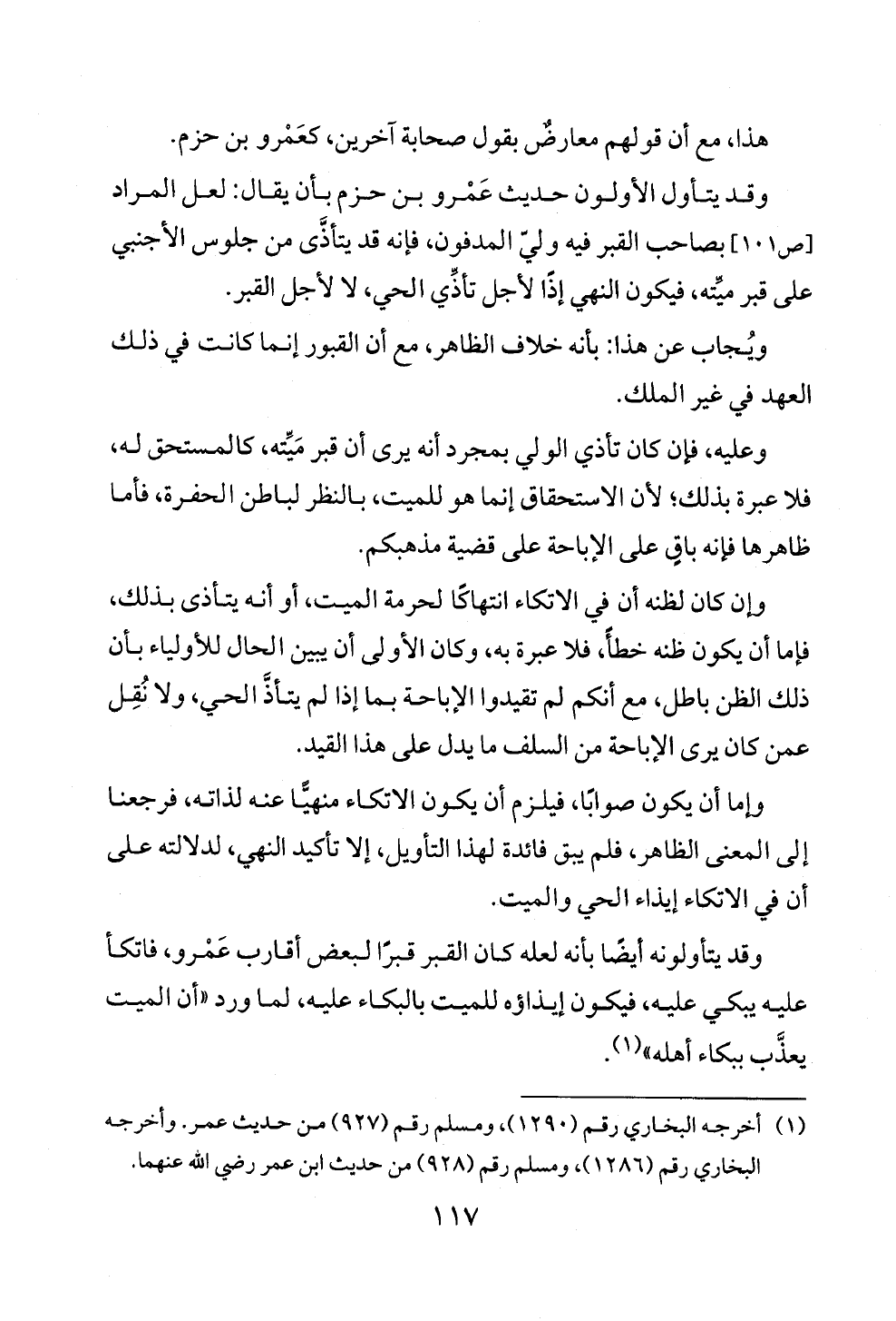 وقد يتأول الأولون حديث عَمْرو بن حزم بأن يقال: لعل المراد [ص ١٠١] بصاحب القبر فيه وليّ المدفون، فإنه قد يتأذَّى من جلوس الأجنبي على قبر ميِّته، فيكون النهي إذًا لأجل تأذِّي الحي، لا لأجل القبر.
