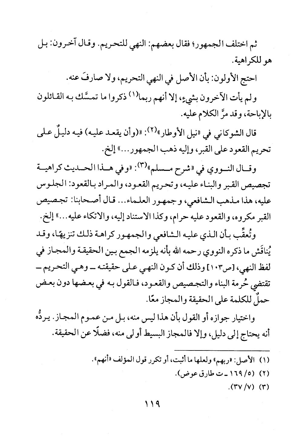 وتُعقِّب بأن الذي عليه الشافعي والجمهور كراهة ذلك تنزيهًا، وقد يُناقَش ما ذكره النووي رحمه الله بأنه يلزمه الجمع بين الحقيقة والمجاز في لفظ النهي، [ص ١٠٣] وذلك أن كون النهي على حقيقته ــ وهي التحريم ــ تقتضي حُرمة البناء والتجصيص والقعود، فالقول به في بعضها دون بعض حملٌ للكلمة على الحقيقة والمجاز معًا.
