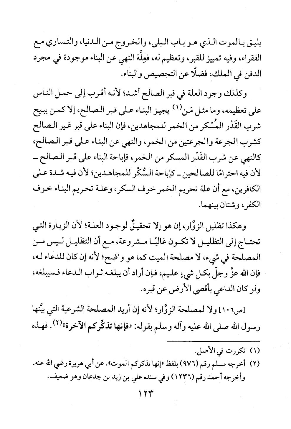 [ص ١٠٦] ولا لمصلحة الزوَّار؛ لأنه إن أريد المصلحة الشرعية التي بيَّنها رسول الله صلى الله عليه وآله وسلم بقوله: "فإنها تذكِّركم الآخرة" (¬٢). فهذه