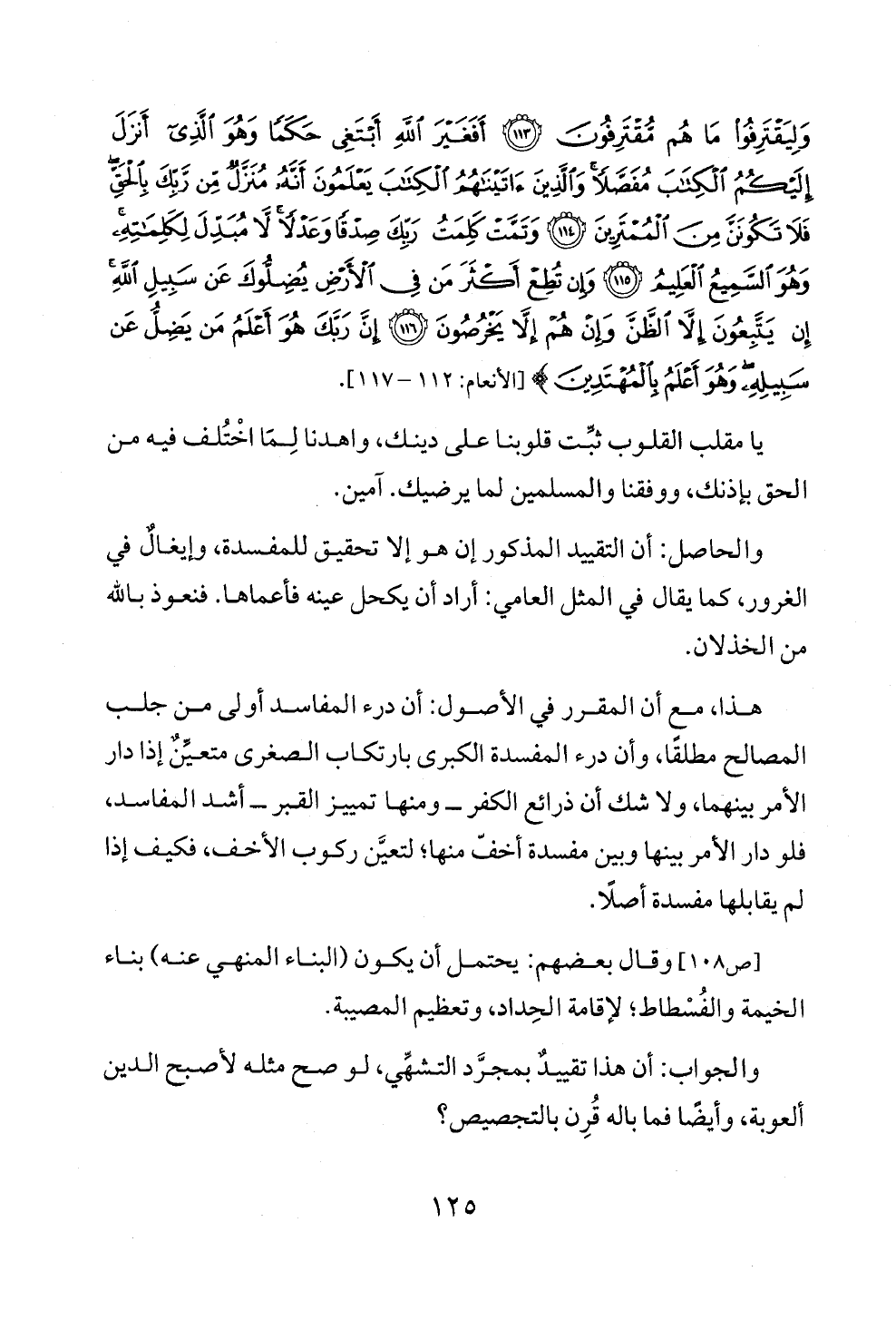 وَلِيَقْتَرِفُوا مَا هُمْ مُقْتَرِفُونَ (١١٣) أَفَغَيْرَ اللَّهِ أَبْتَغِي حَكَمًا وَهُوَ الَّذِي أَنْزَلَ إِلَيْكُمُ الْكِتَابَ مُفَصَّلًا وَالَّذِينَ آتَيْنَاهُمُ الْكِتَابَ يَعْلَمُونَ أَنَّهُ مُنَزَّلٌ مِنْ رَبِّكَ بِالْحَقِّ فَلَا تَكُونَنَّ مِنَ الْمُمْتَرِينَ (١١٤) وَتَمَّتْ كَلِمَتُ رَبِّكَ صِدْقًا وَعَدْلًا لَا مُبَدِّلَ لِكَلِمَاتِهِ وَهُوَ السَّمِيعُ الْعَلِيمُ (١١٥) وَإِنْ تُطِعْ أَكْثَرَ مَنْ فِي الْأَرْضِ يُضِلُّوكَ عَنْ سَبِيلِ اللَّهِ إِنْ يَتَّبِعُونَ إِلَّا الظَّنَّ وَإِنْ هُمْ إِلَّا يَخْرُصُونَ (١١٦) إِنَّ رَبَّكَ هُوَ أَعْلَمُ مَنْ يَضِلُّ عَنْ سَبِيلِهِ وَهُوَ أَعْلَمُ بِالْمُهْتَدِينَ} [الأنعام: ١١٢ - ١١٧].