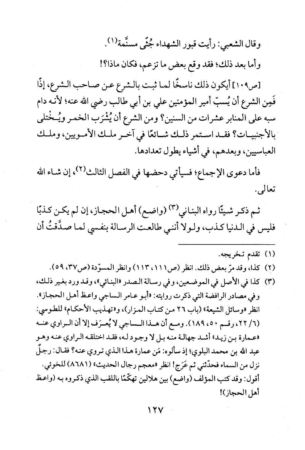 [ص ١٠٩] أيكون ذلك ناسخًا لما ثبت بالشرع عن صاحب الشرع، إذًا فَمِن الشرع أن يُسبّ أمير المؤمنين علي بن أبي طالب رضي الله عنه؛ لأنه دام سبه على المنابر عشرات من السنين؟ ومن الشرع أن يُشْرَب الخمر ويُخْتلى بالأجنبيات؟ فقد استمر ذلك شائعًا في آخر ملك الأمويين، وملك العباسيين، وبعدهم، في أشياء يطول تعدادها.
