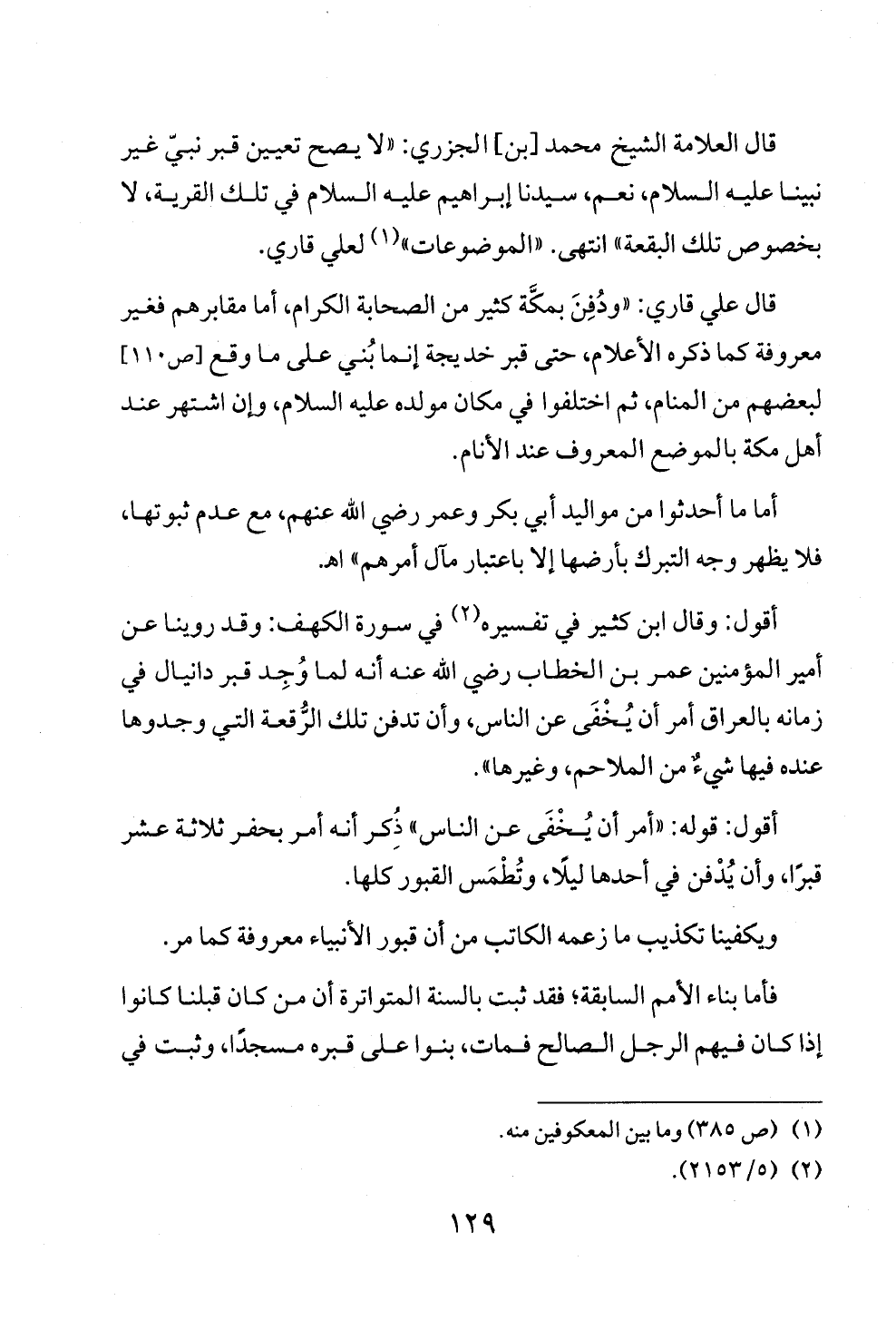 قال العلامة الشيخ محمد [بن] الجزري: "لا يصح تعيين قبر نبيّ غير نبينا عليه السلام، نعم، سيدنا إبراهيم عليه السلام في تلك القرية، لا بخصوص تلك البقعة" انتهى. "الموضوعات" (¬١) لعلي قاري.
