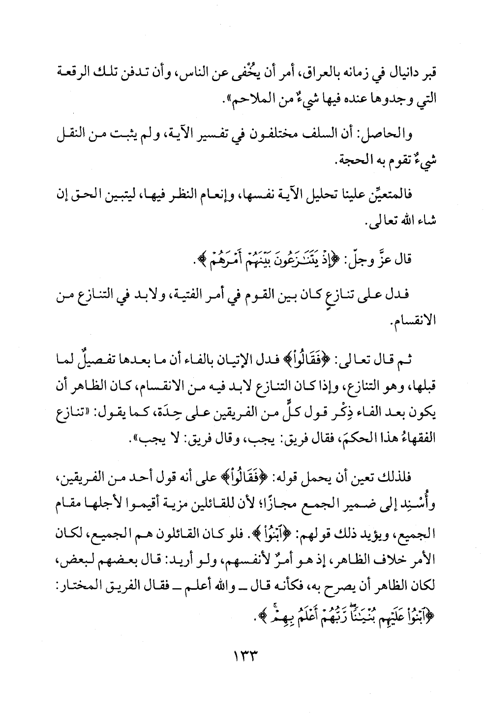 فلذلك تعين أن يحمل قوله: {فَقَالُوا} على أنه قول أحد من الفريقين، وأُسْنِد إلى ضمير الجمع مجازًا؛ لأن للقائلين مزية أقيموا لأجلها مقام الجميع، ويؤيد ذلك قولهم: {ابْنُوا}. فلو كان القائلون هم الجميع، لكان الأمر خلاف الظاهر، إذ هو أمرٌ لأنفسهم، ولو أريد: قال بعضهم لبعض، لكان الظاهر أن يصرح به، فكأنه قال ــ والله أعلم ــ فقال الفريق المختار: {ابْنُوا عَلَيْهِمْ بُنْيَانًا رَبُّهُمْ أَعْلَمُ بِهِمْ}.