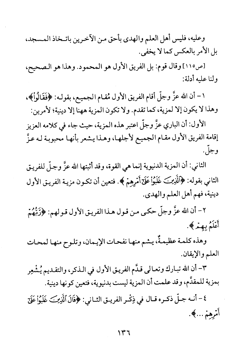 الثاني: أن المزية الدنيوية إنما هي القوة، وقد أثبتها الله عزَّ وجلّ للفريق الثاني بقوله: {الَّذِينَ غَلَبُوا عَلَى أَمْرِهِمْ}. فتعين أن تكون مزية الفريق الأول دينية، فهم أهل العلم والهدى.