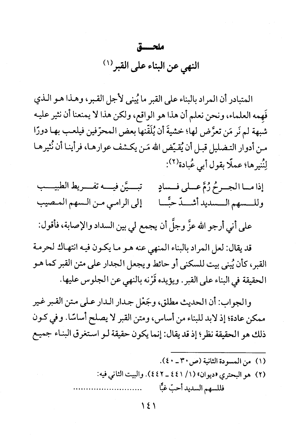 المتبادر أن المراد بالبناء على القبر ما يُبنى لأجل القبر، وهذا هو الذي فَهِمه العلماء، ونحن نعلم أن هذا هو الواقع، ولكن هذا لا يمنعنا أن نثير عليه شبهة لم نَر مَن تعرَّض لها؛ خشيةَ أن يُلَقّنها بعض المحرّفين فيلعب بها دورًا من أدوار التضليل قبل أن يُقيّض الله مَن يكشف عوارها، فرأينا أن نُثيرها لِنُنيرها؛ عملًا بقول أبي عُبادة (¬٢):