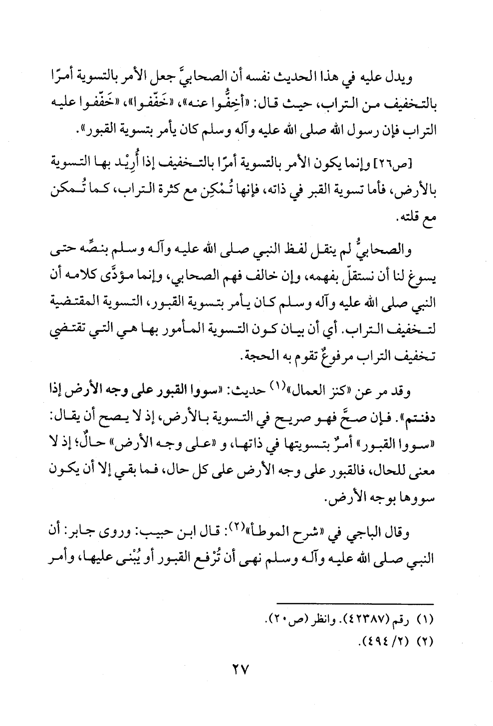 [ص ٢٦] وإنما يكون الأمر بالتسوية أمرًا بالتخفيف إذا أُرِيْد بها التسوية بالأرض، فأما تسوية القبر في ذاته، فإنها تُمْكِن مع كثرة التراب، كما تُمكن مع قلته.