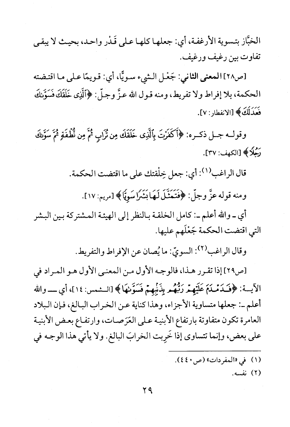 [ص ٢٩] إذا تقرر هذا، فالوجه الأول من المعنى الأول هو المراد في الآية: {فَدَمْدَمَ عَلَيْهِمْ رَبُّهُمْ بِذَنْبِهِمْ فَسَوَّاهَا} [الشمس: ١٤]، أي ــ والله أعلم ــ: جعلها متساوية الأجزاء، وهذا كناية عن الخراب البالغ، فإن البلاد العامرة تكون متفاوتة بارتفاع الأبنية على العَرَصات، وارتفاع بعض الأبنية على بعض، وإنما تتساوى إذا خَرِبت الخرابَ البالغ. ولا يأتي هذا الوجه في