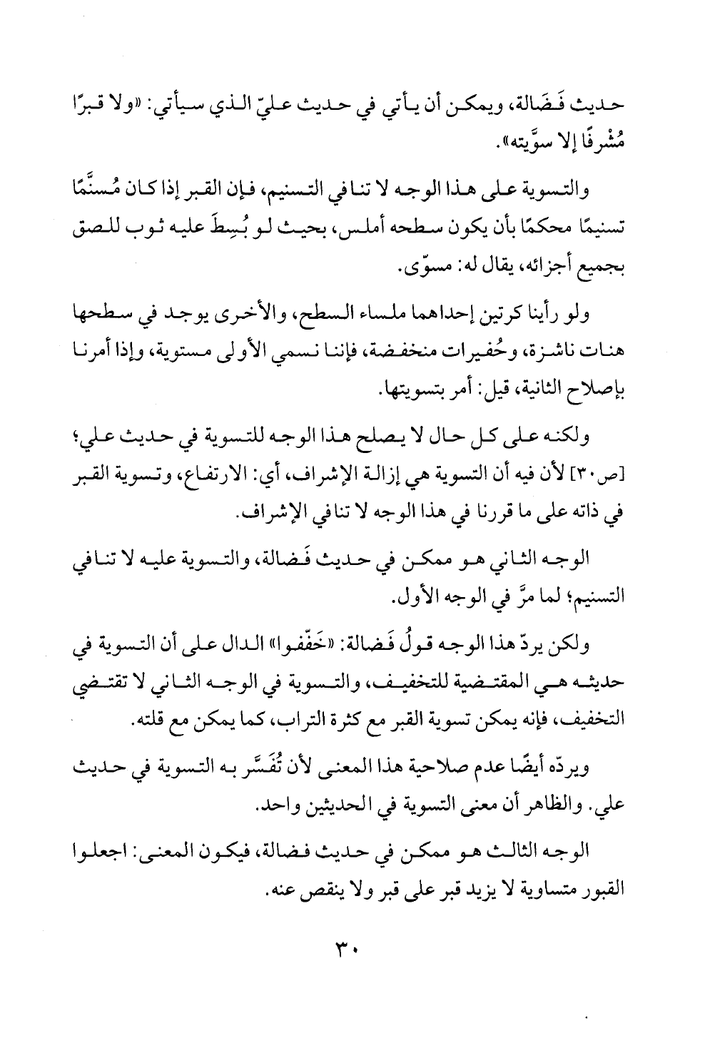 ولكنه على كل حال لا يصلح هذا الوجه للتسوية في حديث علي؛ [ص ٣٠] لأن فيه أن التسوية هي إزالة الإشراف، أي: الارتفاع، وتسوية القبر في ذاته على ما قررنا في هذا الوجه لا تنافي الإشراف.