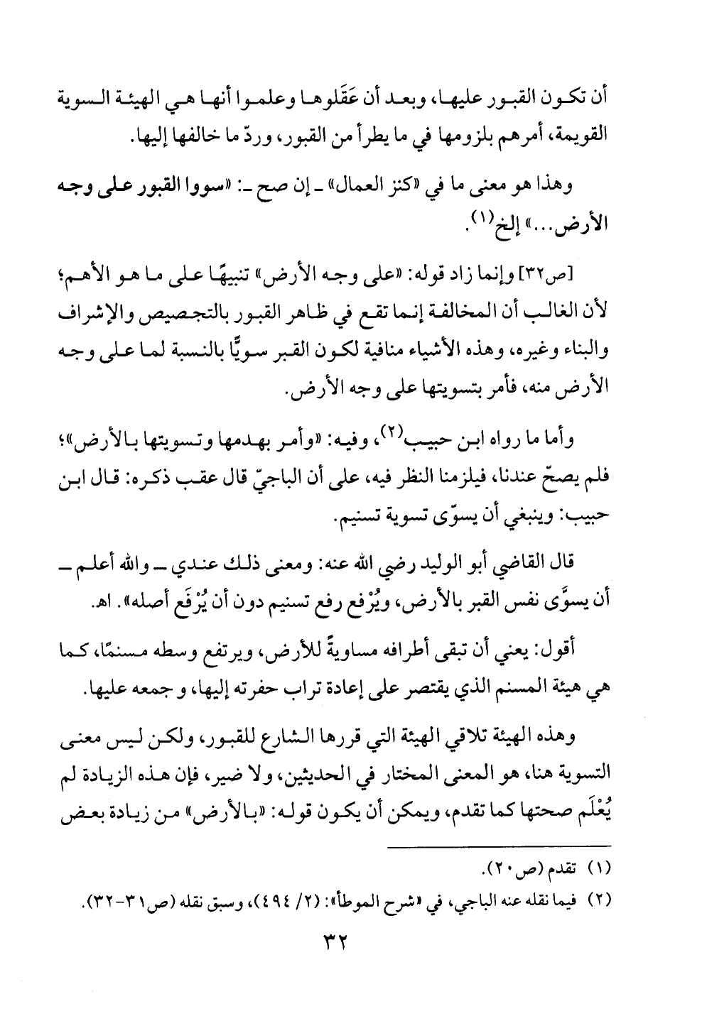 قال القاضي أبو الوليد رضي الله عنه: ومعنى ذلك عندي ــ والله أعلم ــ أن يسوَّى نفس القبر بالأرض، ويُرْفع رفع تسنيم دون أن يُرْفَع أصله". اهـ.