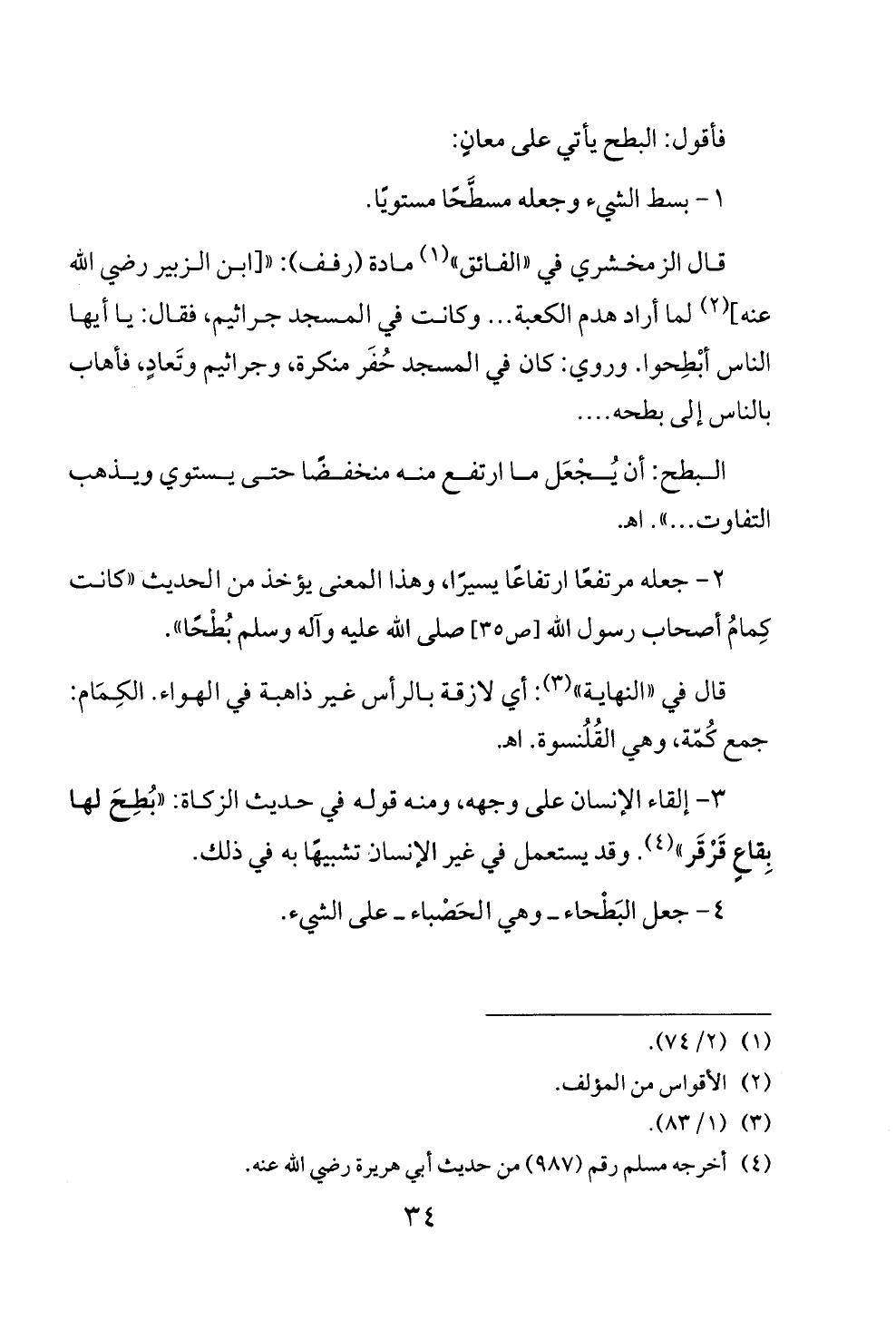 ٢ - جعله مرتفعًا ارتفاعًا يسيرًا، وهذا المعنى يؤخذ من الحديث "كانت كِمامُ أصحاب رسول الله [ص ٣٥] صلى الله عليه وآله وسلم بُطْحًا".