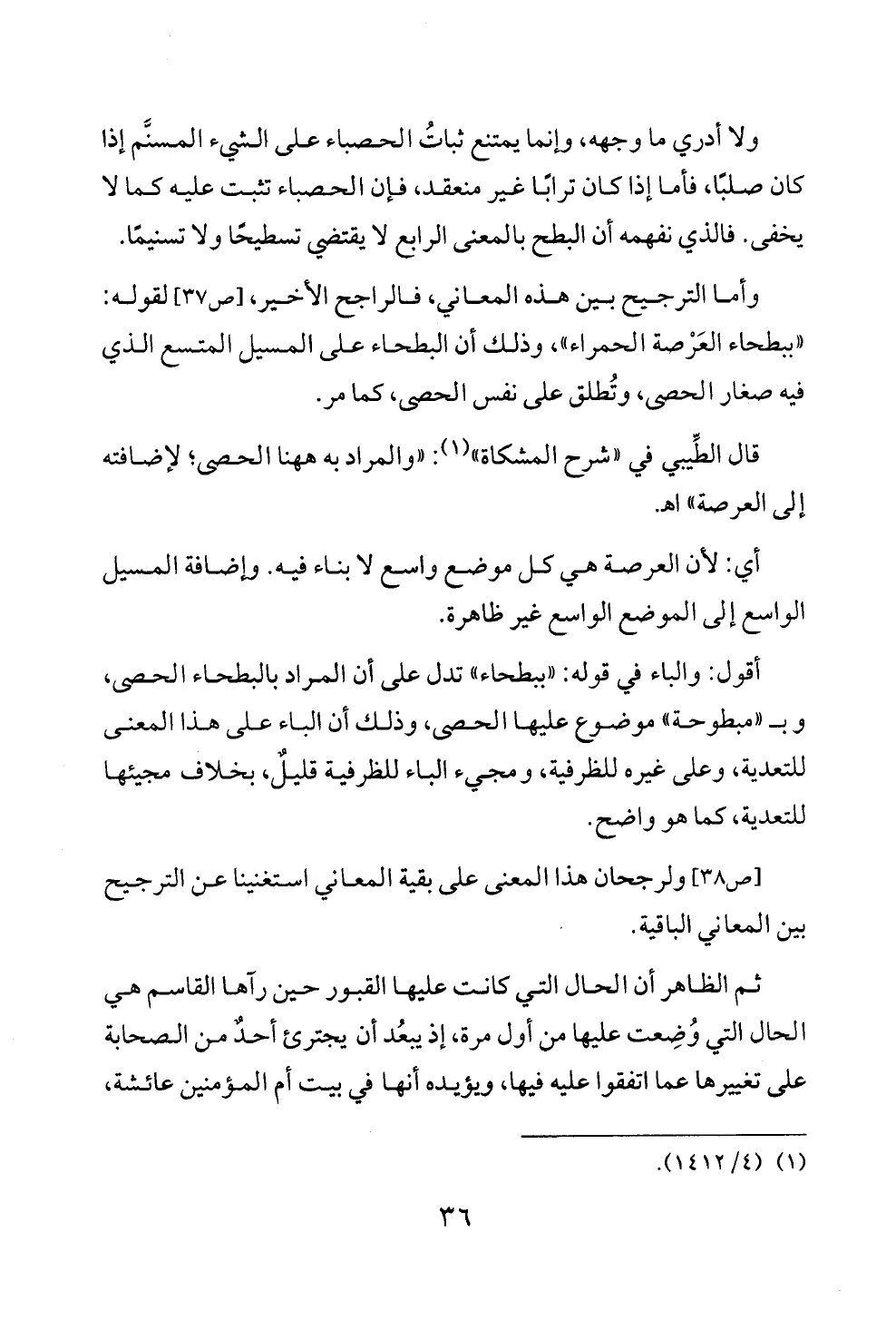 وأما الترجيح بين هذه المعاني، فالراجح الأخير، [ص ٣٧] لقوله: "ببطحاء العَرْصة الحمراء"، وذلك أن البطحاء على المسيل المتسع الذي فيه صغار الحصى، وتُطلق على نفس الحصى، كما مر.