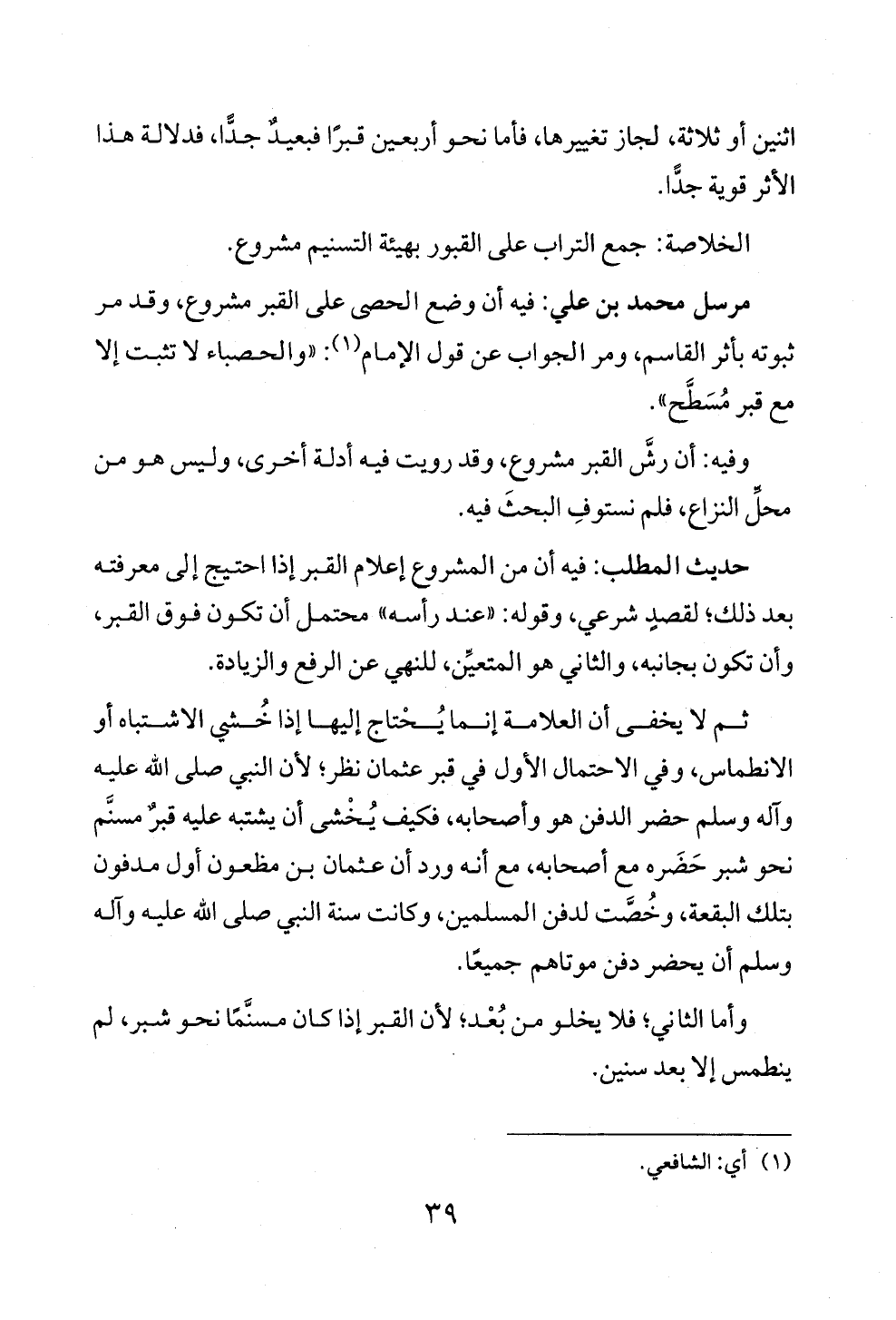 مرسل محمد بن علي: فيه أن وضع الحصى على القبر مشروع، وقد مر ثبوته بأثر القاسم، ومر الجواب عن قول الإمام (¬١): "والحصباء لا تثبت إلا مع قبر مُسَطَّح".