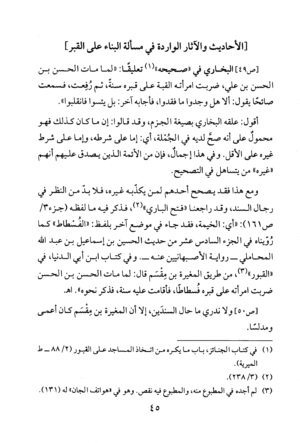 ومع هذا فقد يصحح أحدهم لمن يكذّبه غيره، فلا بدّ من النظر في رجال السند، وقد راجعنا "فتح الباري" (¬٢)، فذكر فيه ما لفظه (جزء ٣/ ص ١٦١): "أي: الخيمة، فقد جاء في موضع آخر بلفظ: "الفُسْطاط" كما رُوّيناه في الجزء السادس عشر من حديث الحسين بن إسماعيل بن عبد الله المحاملي ــ رواية الأصبهانيين عنه ــ. وفي كتاب ابن أبي الدنيا، في "القبور" (¬٣)، من طريق المغيرة بن مِقْسَم قال: لما مات الحسن بن الحسن ضربت امرأته على قبره فُسطاطًا، فأقامت عليه سنة، فذكر نحوه". اهـ.