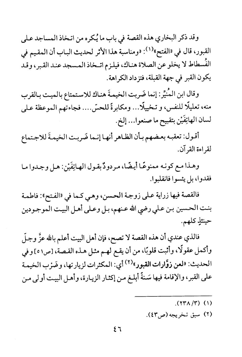 فالذي عندي أن هذه القصة لا تصح، فإن أهل البيت أعلم بالله عزَّ وجلّ وأكمل عقولًا، وأثبت قلوبًا، من أن يقع لهم مثل هذه القصة، [ص ٥١] وفي الحديث: "لعن زوَّارات القبور" (¬٢) أي: المكثرات لزيارتها، وضَرْب الخيمة على القبر، والإقامة فيها سَنةً أبلغ من إكثار الزيارة، وأهل البيت أولى من