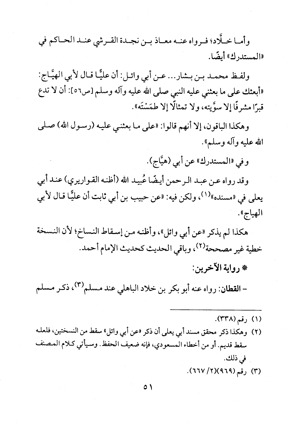 ولفظ محمد بن بشار ... عن أبي وائل: أن عليًّا قال لأبي الهيَّاج: "أبعثك على ما بعثني عليه النبي صلى الله عليه وآله وسلم [ص ٥٦]: أن لا تدع قبرًا مشرفًا إلا سوَّيته، ولا تمثالًا إلا طمَسْتَه".