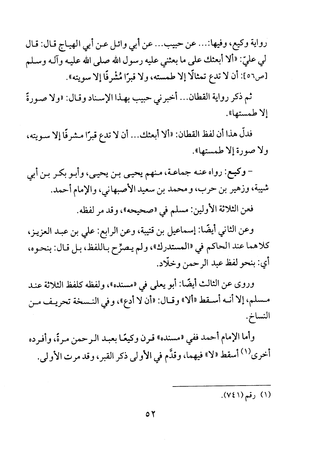 رواية وكيع، وفيها: ... عن حبيب ... عن أبي وائل عن أبي الهياج قال: قال لي عليّ: "ألا أبعثك على ما بعثني عليه رسول الله صلى الله عليه وآله وسلم [ص ٥٦]: أن لا تدع تمثالًا إلا طمسته، ولا قبرًا مُشْرفًا إلا سويته".