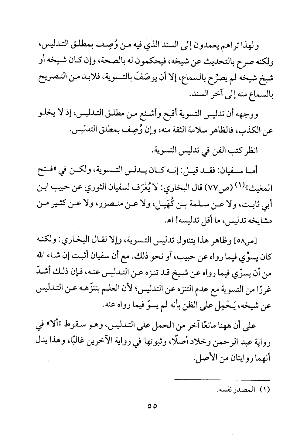 [ص ٥٨] وظاهر هذا يتناول تدليس التسوية، وإلا لقال البخاري: ولكنه كان يسوِّي فيما رواه عن حبيب، أو نحو ذلك. مع أن سفيان أثبت إن شاء الله من أن يسوّي فيما رواه عن شيخ قد تنزه عن التدليس عنه، فإن ذلك أشدّ غررًا من التسوية مع عدم التنزه عن التدليس؛ لأن العلم بتنزّهه عن التدليس عن شيخه، يَحْمِل على الظن بأنه لم يسوّ فيما رواه عنه.