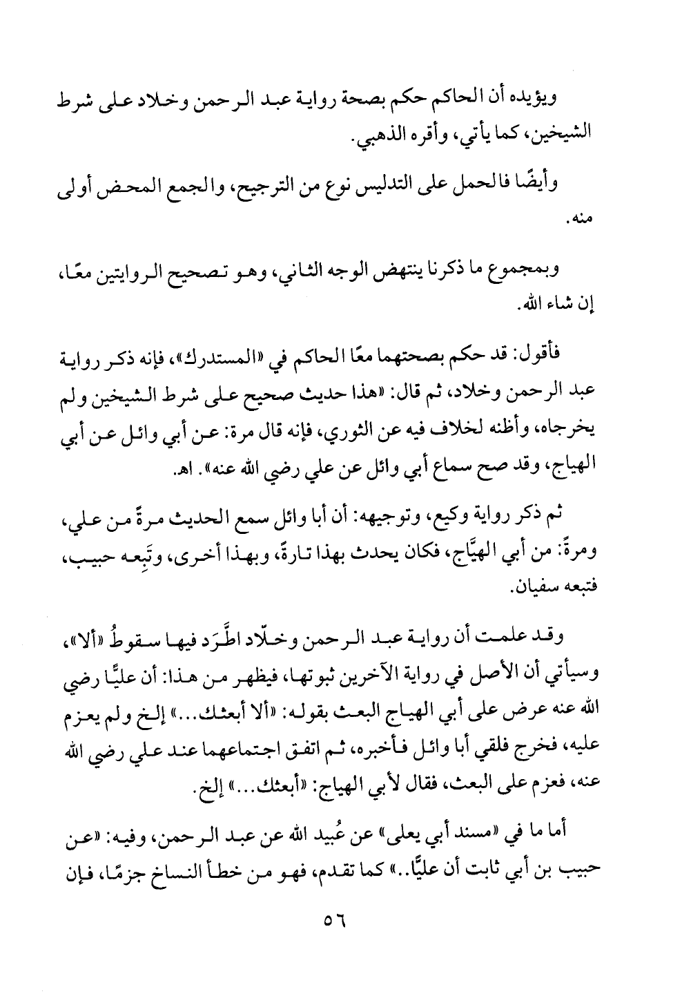 فأقول: قد حكم بصحتهما معًا الحاكم في "المستدرك"، فإنه ذكر رواية عبد الرحمن وخلاد، ثم قال: "هذا حديث صحيح على شرط الشيخين ولم يخرجاه، وأظنه لخلاف فيه عن الثوري، فإنه قال مرة: عن أبي وائل عن أبي الهياج، وقد صح سماع أبي وائل عن علي رضي الله عنه". اهـ.