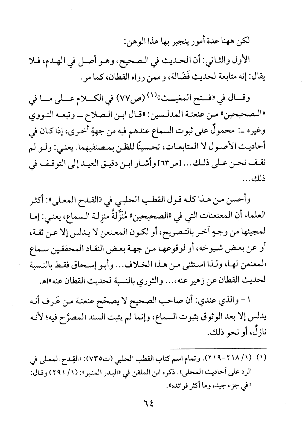 (¬١) (١/ ٢١٨ - ٢١٩). وتمام اسم كتاب القطب الحلبي (ت ٧٣٥): "القِدح المعلى في الرد على أحاديث المحلى". ذكره ابن الملقن في "البدر المنير": (١/ ٢٩١) وقال: "في جزء جيد، وما أكثر فوائده".