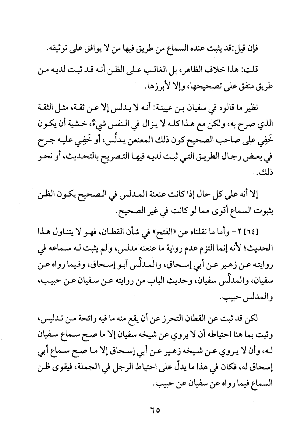 لكن قد ثبت عن القطان التحرز عن أن يقع منه ما فيه رائحة من تدليس، وثبت بما هنا احتياطه أن لا يروي عن شيخه سفيان إلا ما صح سماع سفيان له، وأن لا يروي عن شيخه زهير عن أبي إسحاق إلا ما صح سماع أبي إسحاق له، فكان في هذا ما يدلّ على احتياط الرجل في الجملة، فيقوى ظن السماع فيما رواه عن سفيان عن حبيب.