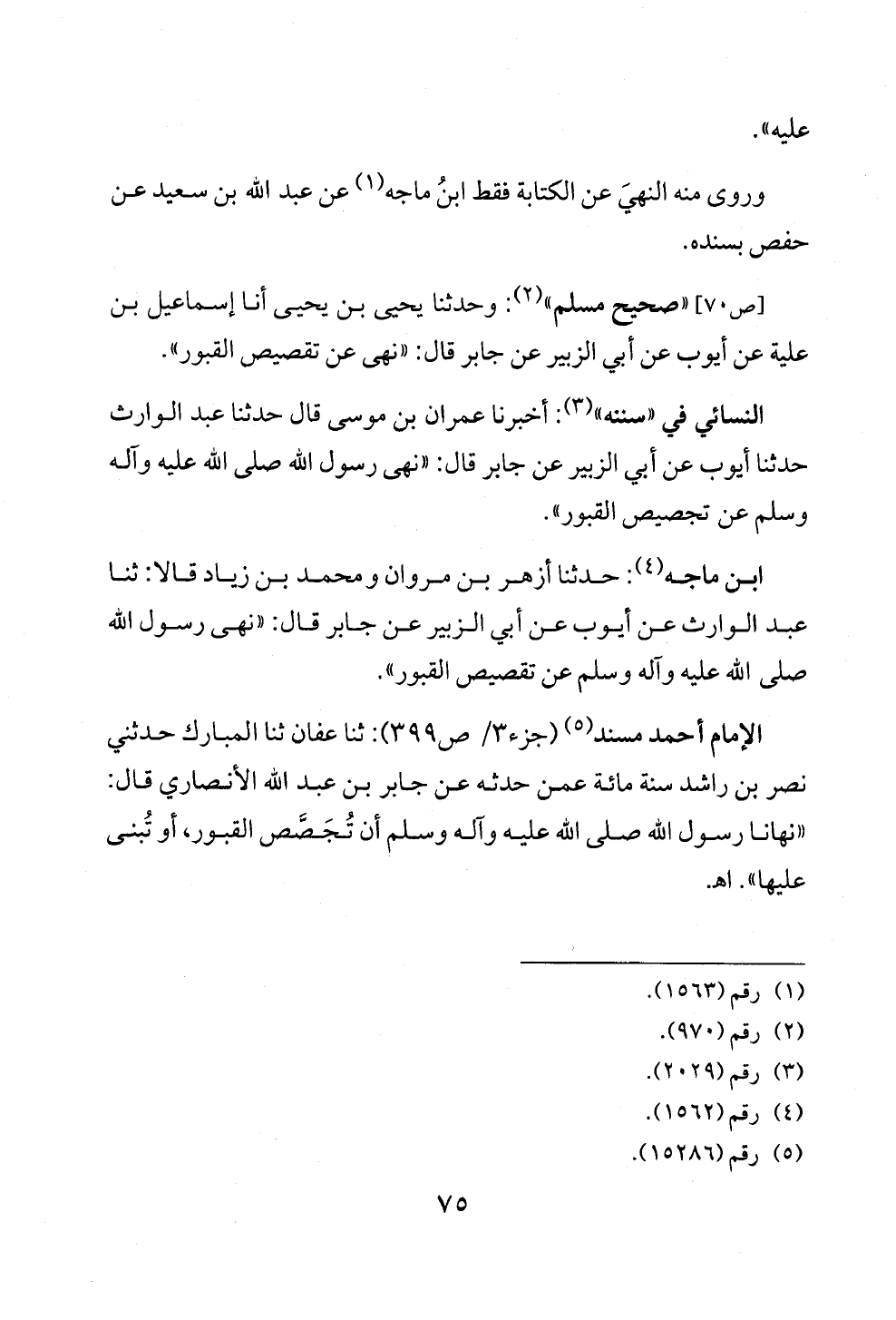 [ص ٧٠] "صحيح مسلم" (¬٢): وحدثنا يحيى بن يحيى أنا إسماعيل بن علية عن أيوب عن أبي الزبير عن جابر قال: "نهى عن تقصيص القبور".