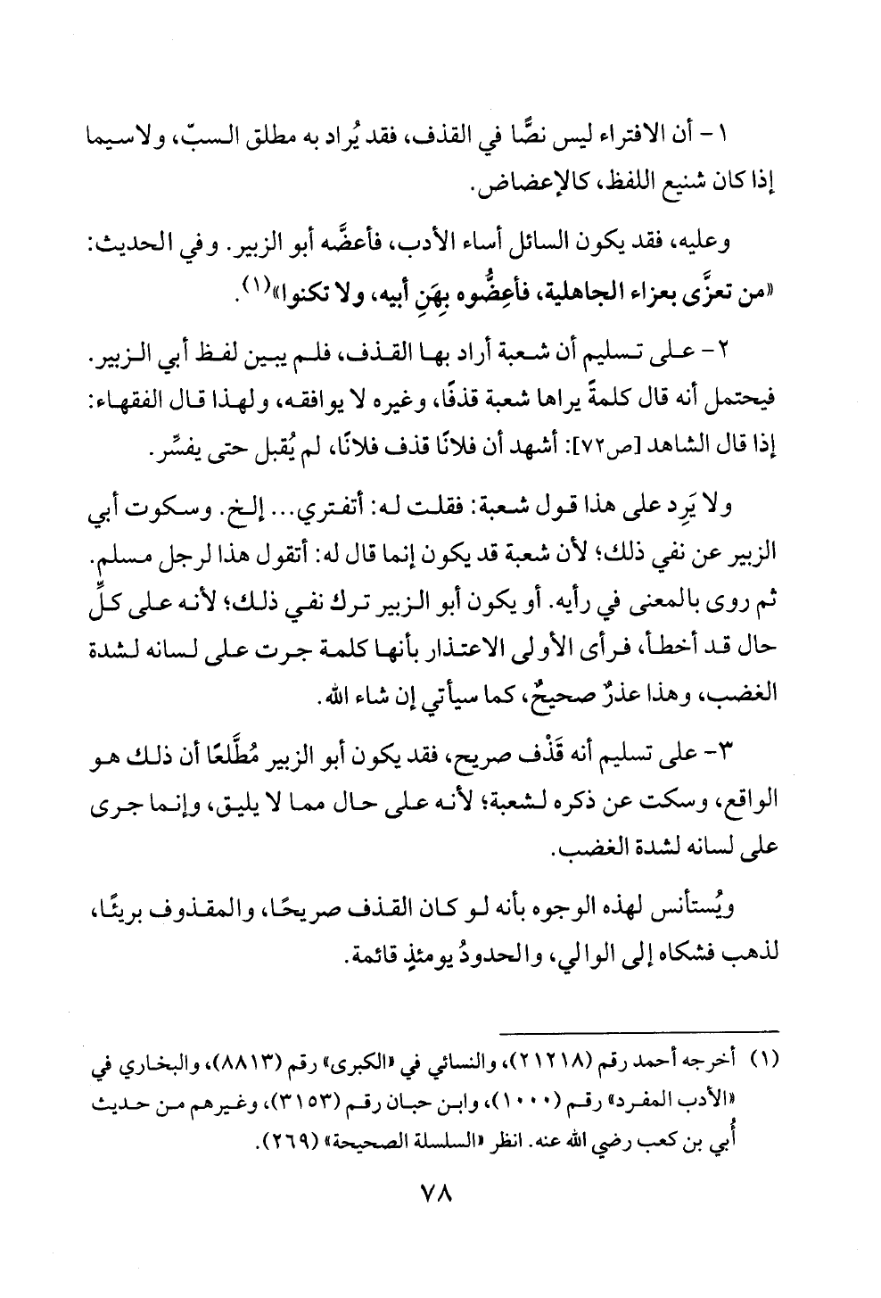 ٢ - على تسليم أن شعبة أراد بها القذف، فلم يبين لفظ أبي الزبير. فيحتمل أنه قال كلمةً يراها شعبة قذفًا، وغيره لا يوافقه، ولهذا قال الفقهاء: إذا قال الشاهد [ص ٧٢]: أشهد أن فلانًا قذف فلانًا، لم يُقبل حتى يفسِّر.