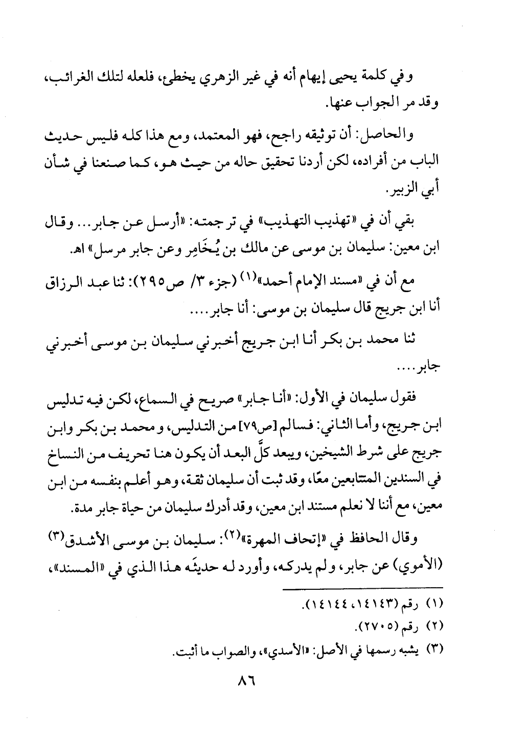 فقول سليمان في الأول: "أنا جابر" صريح في السماع، لكن فيه تدليس ابن جريج، وأما الثاني: فسالم [ص ٧٩] من التدليس، ومحمد بن بكر وابن جريج على شرط الشيخين، ويبعد كلَّ البعد أن يكون هنا تحريف من النساخ في السندين المتتابعين معًا، وقد ثبت أن سليمان ثقة، وهو أعلم بنفسه من ابن معين، مع أننا لا نعلم مستند ابن معين، وقد أدرك سليمان من حياة جابر مدة.