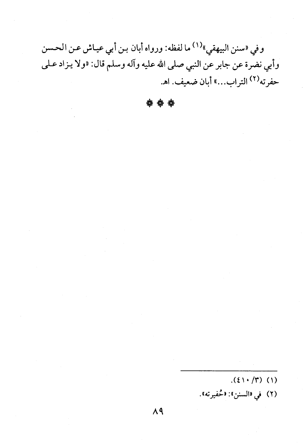 وفي "سنن البيهقي" (¬١) ما لفظه: ورواه أبان بن أبي عياش عن الحسن وأبي نضرة عن جابر عن النبي صلى الله عليه وآله وسلم قال: "ولا يزاد على حفرته (¬٢) التراب ... " أبان ضعيف. اهـ .