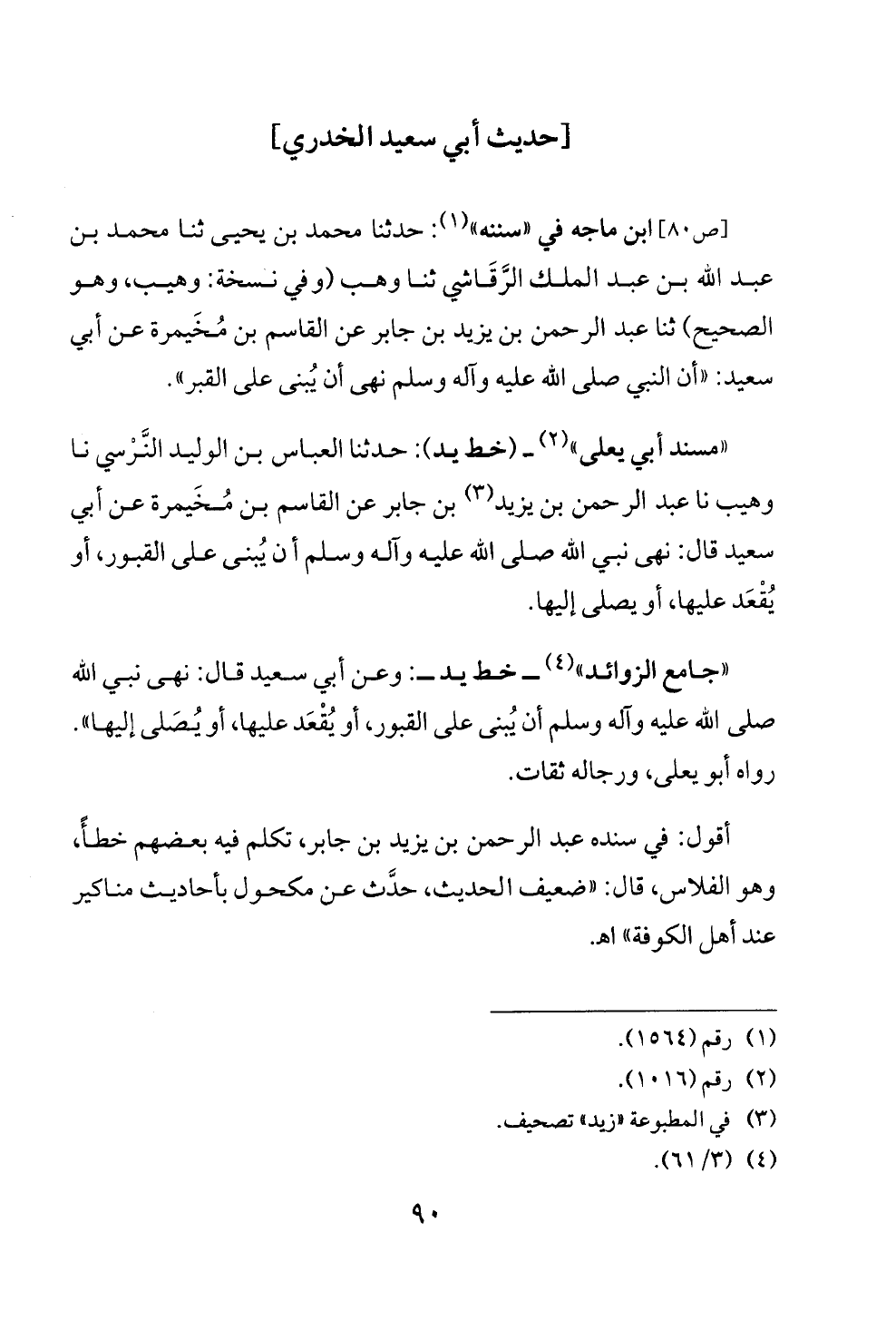 "جامع الزوائد" (¬٤) ــ خط يد ــ: وعن أبي سعيد قال: نهى نبي الله صلى الله عليه وآله وسلم أن يُبنى على القبور، أو يُقْعَد عليها، أو يُصَلى إليها". رواه أبو يعلى، ورجاله ثقات.