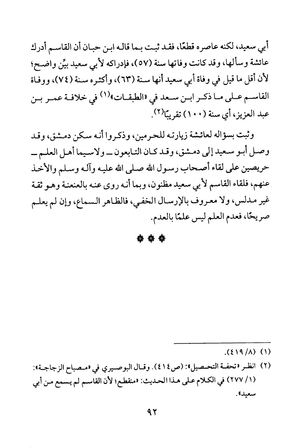 أبي سعيد، لكنه عاصره قطعًا، فقد ثبت بما قاله ابن حبان أن القاسم أدرك عائشة وسألها، وقد كانت وفاتها سنة (٥٧)، فإدراكه لأبي سعيد بيِّن واضح؛ لأن أقل ما قيل في وفاة أبي سعيد أنها سنة (٦٣)، وأكثره سنة (٧٤)، ووفاة القاسم على ما ذكر ابن سعد في "الطبقات" (¬١) في خلافة عمر بن عبد العزيز، أي سنة (١٠٠) تقريبًا (¬٢).