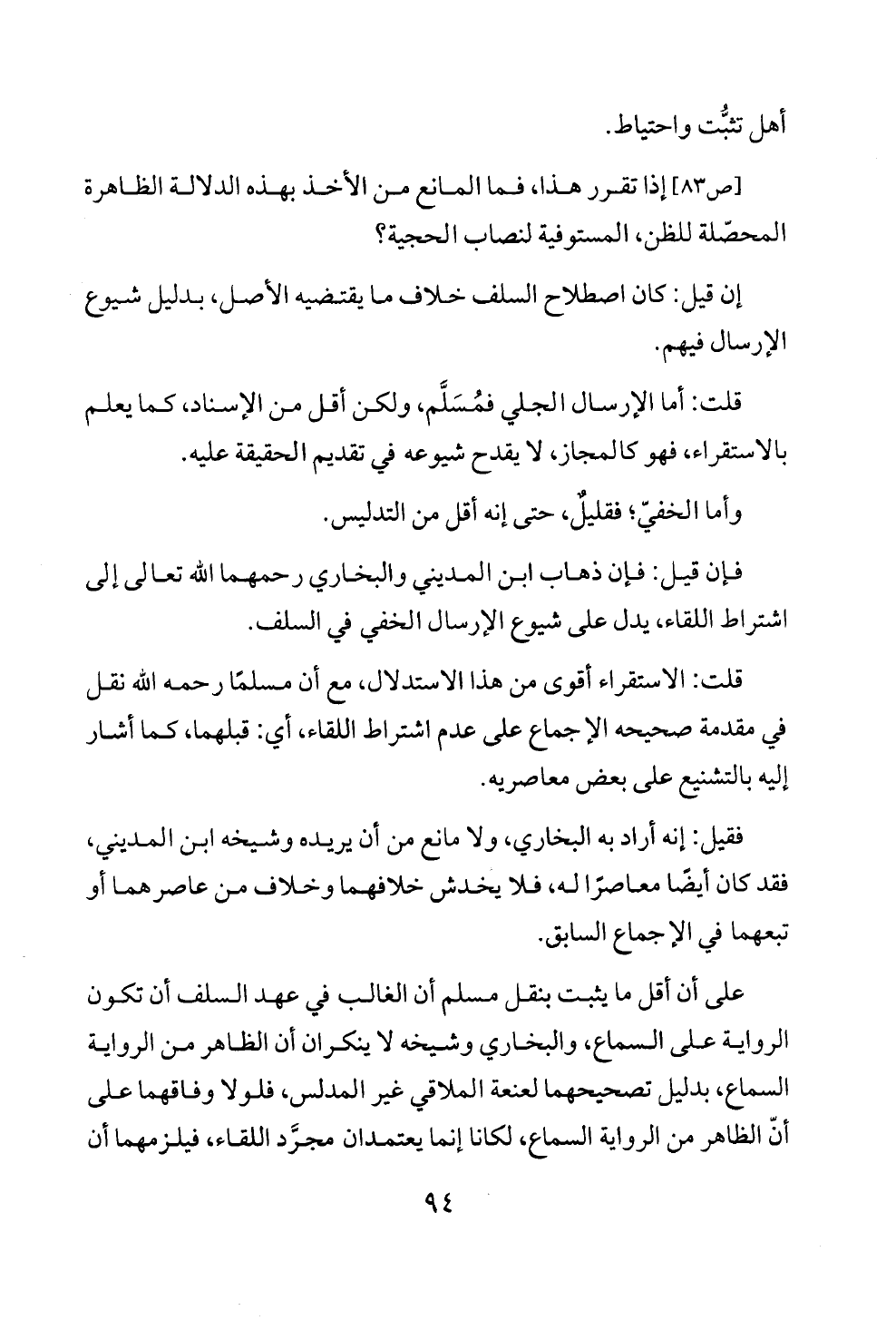 على أن أقل ما يثبت بنقل مسلم أن الغالب في عهد السلف أن تكون الرواية على السماع، والبخاري وشيخه لا ينكران أن الظاهر من الرواية السماع، بدليل تصحيحهما لعنعة الملاقي غير المدلس، فلولا وفاقهما على أنّ الظاهر من الرواية السماع، لكانا إنما يعتمدان مجرَّد اللقاء، فيلزمهما أن