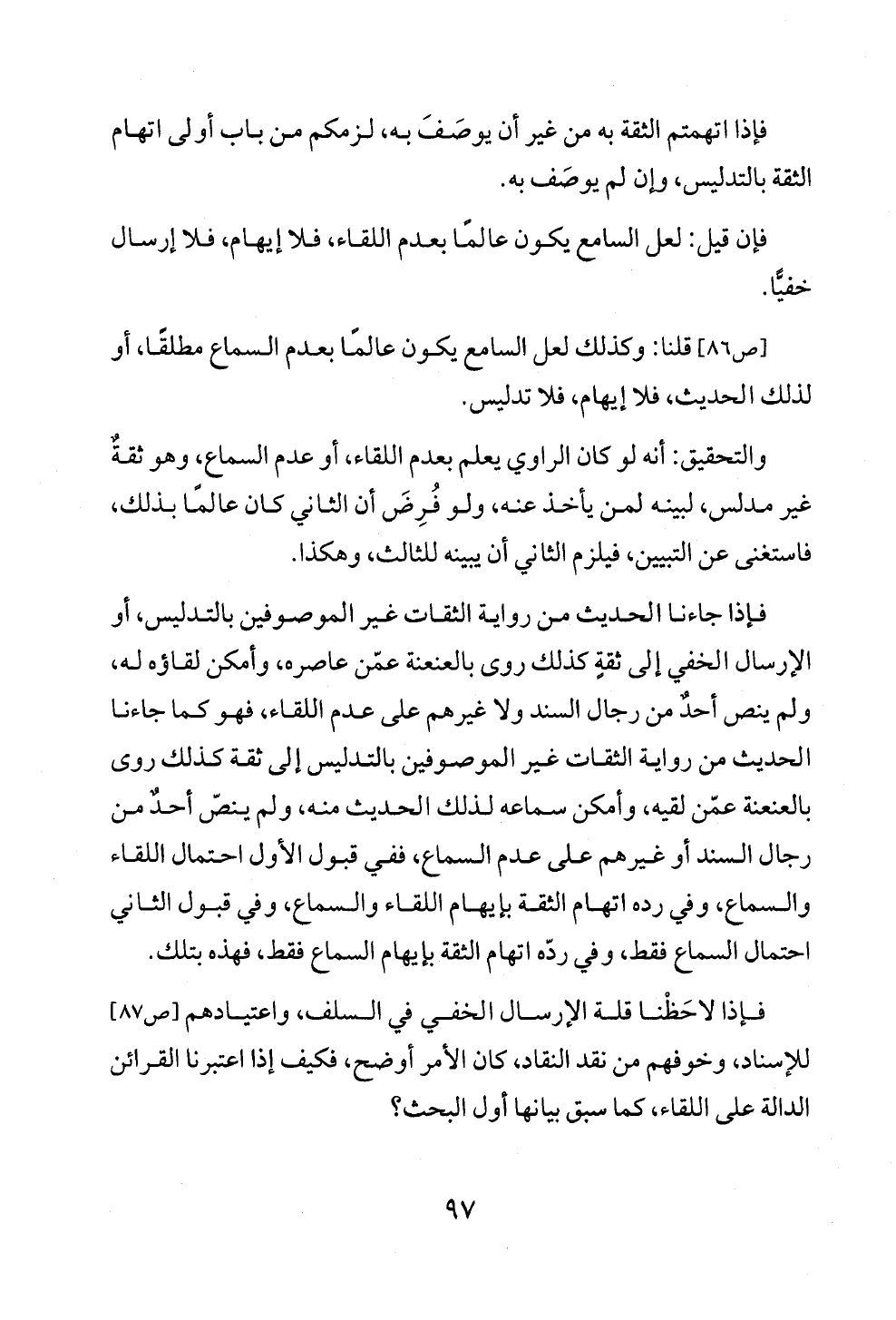 [ص ٨٦] قلنا: وكذلك لعل السامع يكون عالمًا بعدم السماع مطلقًا، أو لذلك الحديث، فلا إيهام، فلا تدليس.
