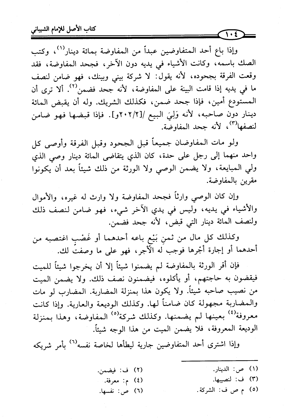 فإن أقر الورثة بالمفاوضة لم يضمنوا شيئاً إلا أن يخرجوا شيئاً للميت فيقضون به حاجتهم، أو يأكلوه، فيضمنون نصف ذلك. ولا يضمن الميت من نصيب صاحبه شيئاً. ولا يكون هذا بمنزلة المضاربة. المضارب لو مات والمضاربة مجهولة كان ضامناً لها. وكذلك الوديعة والعارية. وإذا كانت معروفة (¬4) بعينها لم يضمنها. وكذلك شركة (¬5) المفاوضة، وهذا بمنزلة الوديعة المعروفة، فلا يضمن الميت من هذا الوجه شيئاً.