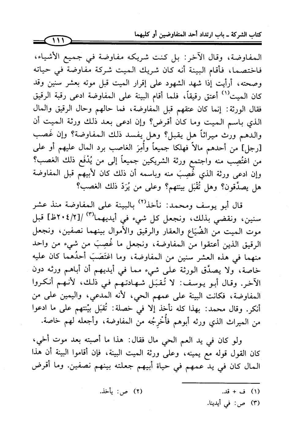 قال أبو يوسف ومحمد: نأخذ (¬2) بالبينة على المفاوضة منذ عشر سنين، ونقضي بذلك، ونجعل كل شيء في أيديهما (¬3) قبل موت الميت من الضِّيَاع والعقار والرقيق والأموال بينهما نصفين، ونجعل الرقيق الذين أعتقوا من المفاوضة، ونجعل ما غُصِبَ من شيء من واحد منهما في هذه العشر سنين من المفاوضة، وما اغتَصَبَ أحدُهما كان عليه خاصة، ولا يصدَّق الورثة على شيء مما في أيديهم أن أباهم ورثه دون الآخر. وقال أبو يوسف: لا تُقبَل شهادتهم في ذلك، لأنهم أنكروا المفاوضة، فكانت البينة على عمهم الحي، لأنه المدعي، واليمين على من أنكر. وقال محمد: بهذا كله نأخذ إلا في خصلة: تُقبَل بيِّنتهم على ما ادعوا من الميراث الذي ورثه أبوهم فأُخْرِجُه من المفاوضة، وأجعله لهم خاصة.