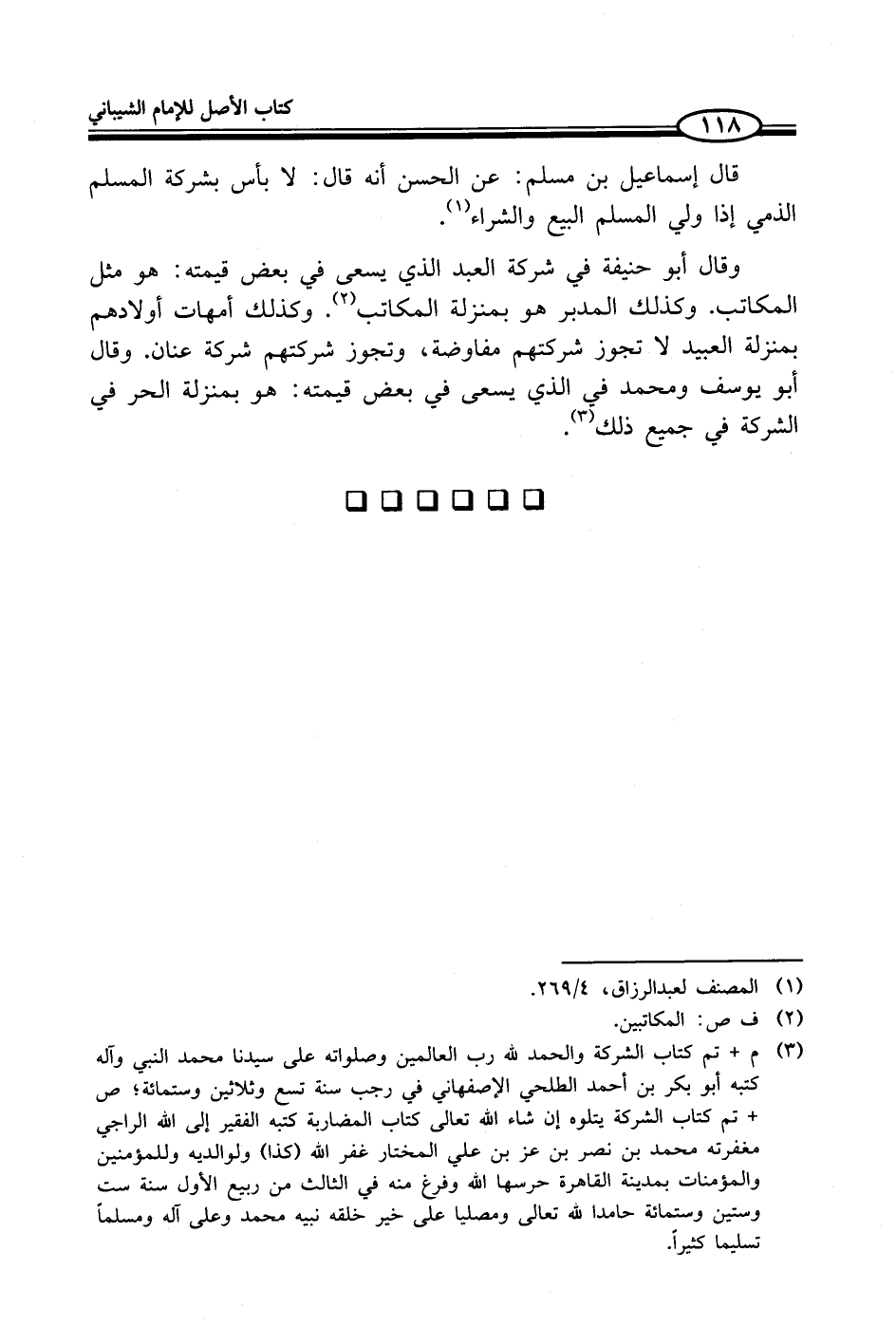 (¬3) م + تم كتاب الشركة والحمد لله رب العالمين وصلواته على سيدنا محمد النبي وآله كتبه أبو بكر بن أحمد الطلحي الإصفهاني في رجب سنة تسع وثلاثين وستمائة؛ ص + تم كتاب الشركة يتلوه إن شاء الله تعالى كتاب المضاربة كتبه الفقير إلى الله الراجي مغفرته محمد بن نصر بن عز بن علي المختار غفر الله (كذا) ولوالديه وللمؤمنين والمؤمنات بمدينة القاهرة حرسها الله وفرغ منه في الثالث من ربيع الأول سنة ست وستين وستمائة حامدا لله تعالى ومصليا على خير خلقه نبيه محمد وعلى آله ومسلماً تسليما كثيراً.
