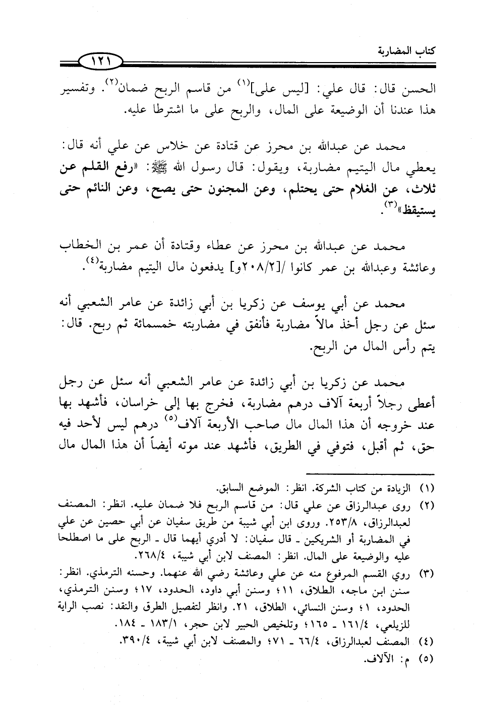 محمد عن عبد الله بن محرز عن قتادة عن خلاس عن علي أنه قال: يعطي مال اليتيم مضاربة، ويقول: قال رسول الله - صلى الله عليه وسلم -: "رفع القلم عن ثلاث، عن الغلام حتى يحتلم، وعن المجنون حتى يصح، وعن النائم حتى يستيقظ" (¬3).