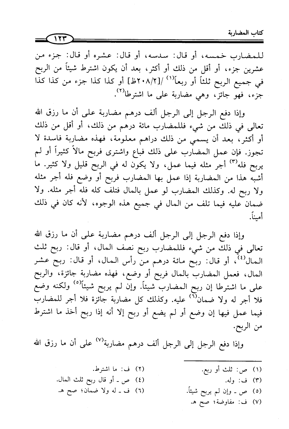 وإذا دفع الرجل إلى الرجل ألف درهم مضاربة على أن ما رزق الله تعالى في ذلك من شيء فللمضارب ربح نصف المال، أو قال: ربح ثلث المال (¬4)، أو قال: ربح مائة درهم من رأس المال، أو قال: ربح عشر المال، فعمل المضارب بالمال فربح أو وضع، فهذه مضاربة جائزة، والربح على ما اشترطا إن ربح المضارب شيئاً. وإن لم يربح شيئاً (¬5) ولكنه وضع فلا أجر له ولا ضمان (¬6) عليه. وكذلك كل مضاربة جائزة فلا أجر للمضارب فيما عمل فيها إن وضع أو لم يضع أو ربح إلا أنه إذا ربح أخذ ما اشترط من الربح.
