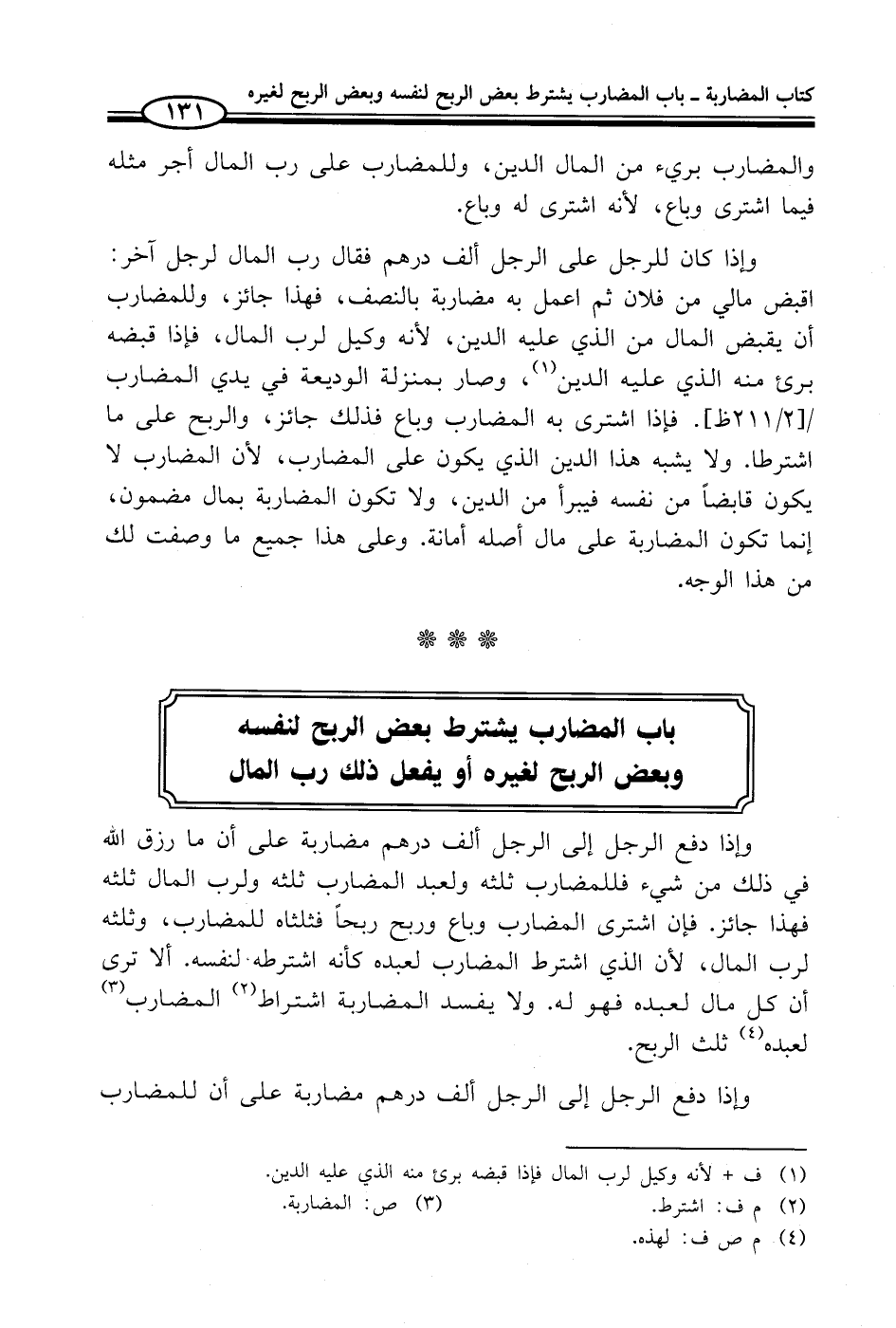 وإذا كان للرجل على الرجل ألف درهم فقال رب المال لرجل آخر: اقبض مالي من فلان ثم اعمل به مضاربة بالنصف، فهذا جائز، وللمضارب أن يقبض المال من الذي عليه الدين، لأنه وكيل لرب المال، فإذا قبضه برئ منه الذي عليه الدين (¬1)، وصار بمنزلة الوديعة في يدي المضارب. فإذا اشترى به المضارب وباع فذلك جائز، والربح على ما اشترطا. ولا يشبه هذا الدين الذي يكون على المضارب، لأن المضارب لا يكون قابضًا من نفسه فيبرأ من الدين، ولا تكون المضاربة بمال مضمون، إنما تكون المضاربة على مال أصله أمانة. وعلى هذا جميع ما وصفت لك من هدا الوجه.