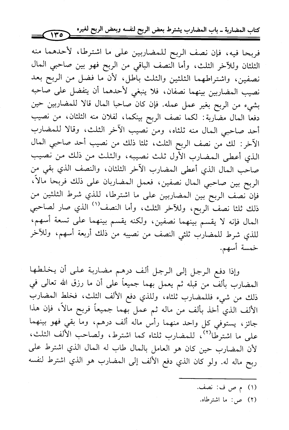 فربحا فيه، فإن نصف الربح للمضاربين على ما اشترطا، لأحدهما منه الثلثان وللآخر الثلث، وأما النصف الباقي من الربح فهو بين صاحبي المال نصفين، واشتراطهما الثلثين والثلث باطل، لأن ما فضل من الربح بعد نصيب المضاربين بينهما نصفان، فلا ينبغي لأحدهما أن يتفضل على صاحبه بشيء من الربح بغير عمل عمله. فإن كان صاحبا المال قالا للمضاربين حين دفعا المال مضاربة: لكما نصف الربح بينكما، لفلان منه الثلثان، من نصيب أحد صاحبي المال منه ثلثاه، ومن نصيب الآخر الثلث، وقالا للمضارب الآخر: لك من نصف الربح الثلث، ثلثا ذلك من نصيب أحد صاحبي المال الذي أعطى المضارب الأول ثلث نصيبه، والثلث من ذلك من نصيب صاحب المال الذي أعطى المضارب الآخر الثلثان، والنصف الذي بقي من الربح بين صاحبي المال نصفين، فعمل المضاربان على ذلك فربحا مالاً، فإن نصف الربح بين المضاربين على ما اشترطا، للذي شرط الثلثين من ذلك ثلثا نصف الربح، وللآخر الثلث، وأما النصف (¬1) الذي صار لصاحبي المال فإنه لا يقسم بينهما نصفين، ولكنه يقسم بينهما على تسعة أسهم، للذي شرط للمضارب ثلثي النصف من نصيبه من ذلك أربعة أسهم، وللآخر خمسة أسهم.