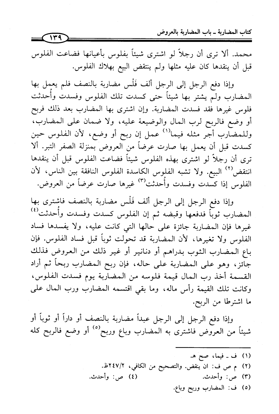 وإذا دفع الرجل إلى الرجل ألف فَلْس مضاربة بالنصف فاشترى بها المضارب ثوباً فدفعها وقبضه ثم إن الفلوس كسدت وفسدت وأُحدثت (¬4) غيرها فإن المضاربة جائزة على حالها التي كانت عليه، ولا يفسدها فساد الفلوس ولا تغيرها، لأن المضاربة قد تحولت ثوباً قبل فساد الفلوس. فإن باع المضارب الثوب بدراهم أو دنانير أو غير ذلك من العروض فذلك جائز، وهو على المضاربة على حاله، فإن ربح المضارب ربحاً ثم أراد القسمة أخذ رب المال قيمة فلوسه من المضاربة يوم فسدت الفلوس، وكانت تلك القيمة رأس ماله، وما بقي اقتسمه المضارب ورب المال على ما اشترطا من الربح.