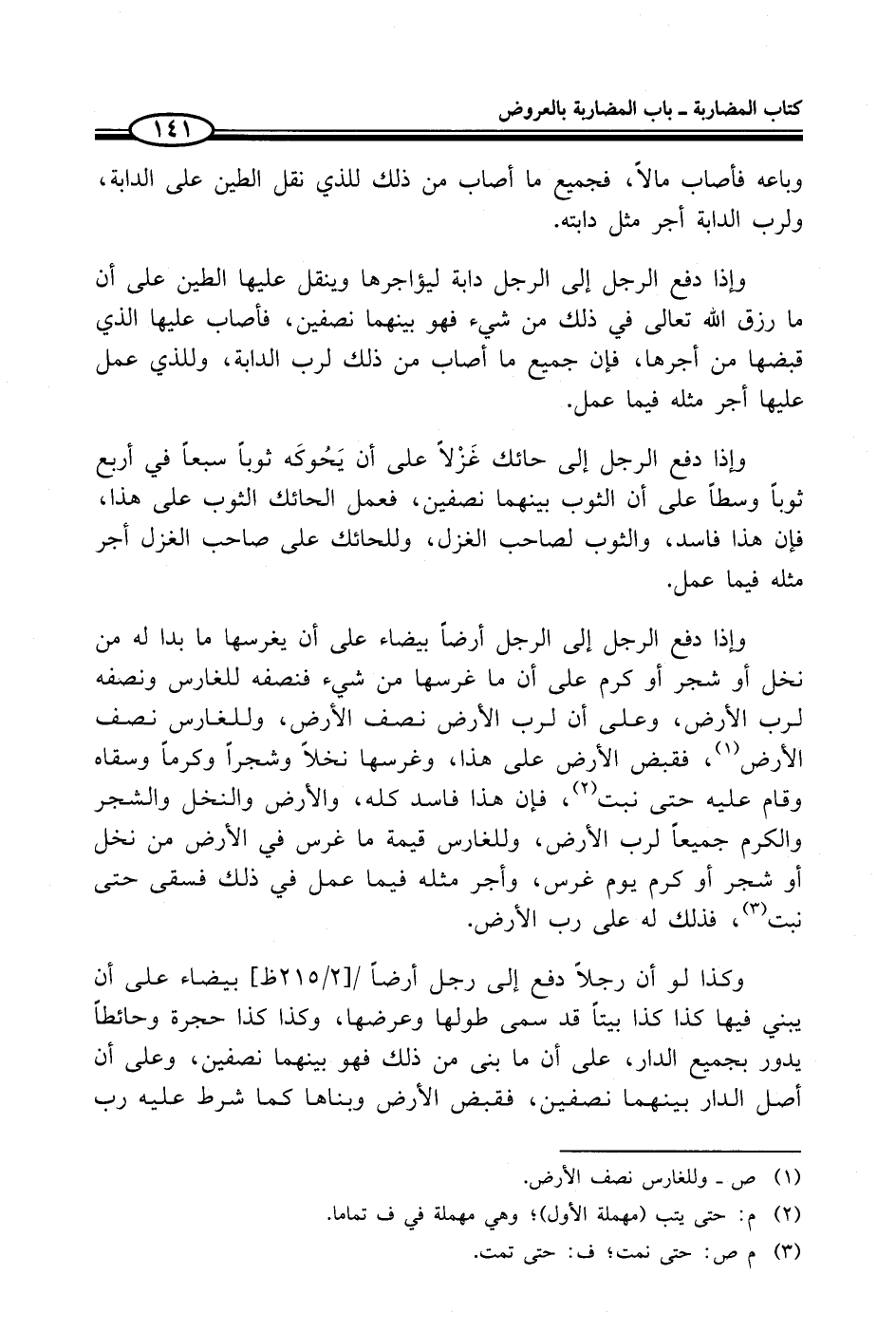 وكذا لو أن رجلاً دفع إلى رجل أرضاً بيضاء على أن يبني فيها كذا كذا بيتاً قد سمى طولها وعرضها، وكذا كذا حجرة وحائطاً يدور بجميع الدار، على أن ما بنى من ذلك فهو بينهما نصفين، وعلى أن أصل الدار بينهما نصفين، فقبض الأرض وبناها كما شرط عليه رب