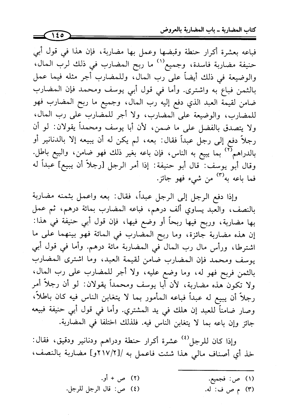 فباعه بعشرة أكرار حنطة وقبضها وعمل بها مضاربة، فإن هذا في قول أبي حنيفة مضاربة فاسدة، وجميع (¬1) ما ربح المضارب في ذلك لرب المال، والوضيعة في ذلك أيضاً على رب المال، وللمضارب أجر مثله فيما عمل بالثمن فباع به واشترى. وأما في قول أبي يوسف ومحمد فإن المضارب ضامن لقيمة العبد الذي دفع إليه رب المال، وجميع ما ربح المضارب فهو للمضارب، والوضيعة على المضارب، ولا أجر للمضارب على رب المال، ولا يتصدق بالفضل على ما ضمن، لأن أبا يوسف ومحمدًا يقولان: لو أن رجلاً دفع إلى رجل عبداً فقال: بعه، لم يكن له أن يبيعه إلا بالدنانير أو بالدراهم (¬2) بما يبيع به الناس، فإن باعه بغير ذلك فهو ضامن، والبيع باطل. وقال أبو يوسف: قال أبو حنيفة: إذا أمر الرجل [رجلاً أن يبيع] عبداً له فما باعه به (¬3) من شيء فهو جائز.