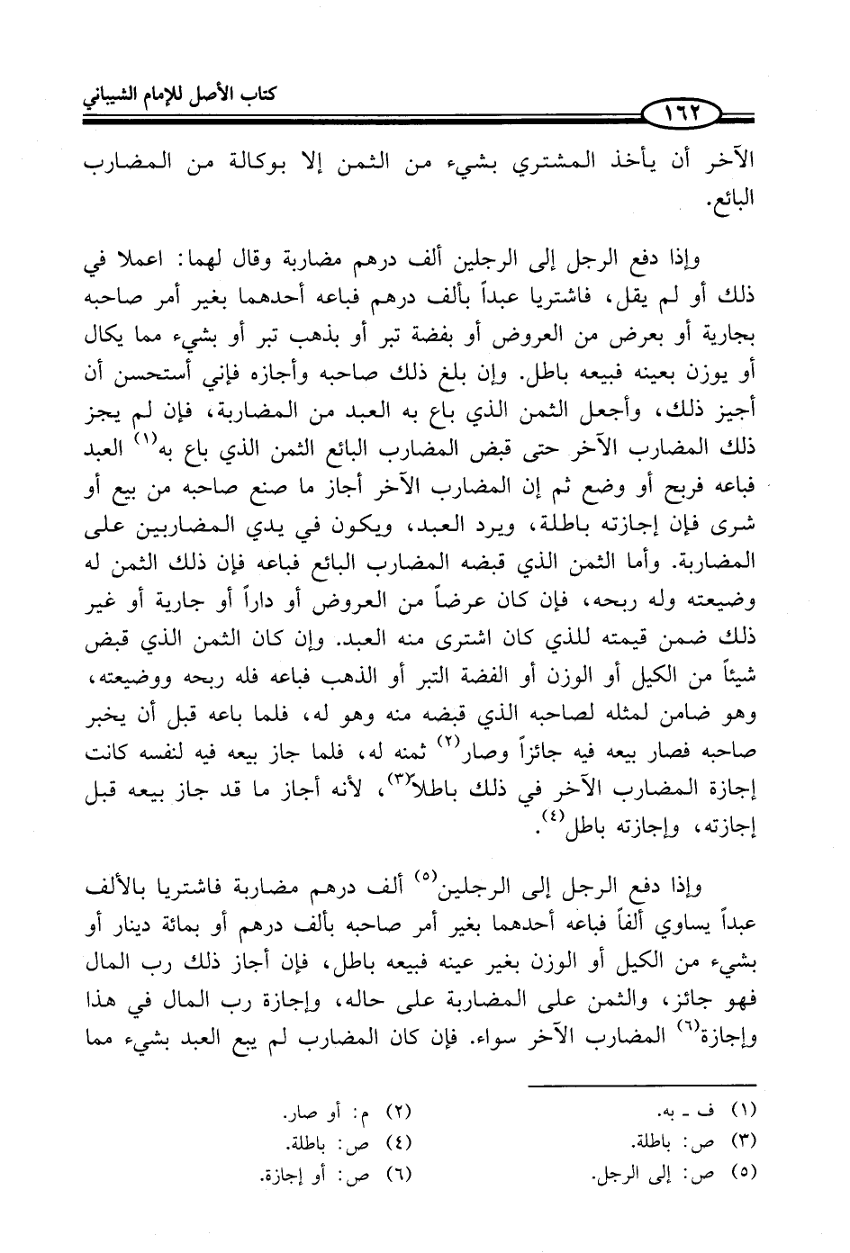 وإذا دفع الرجل إلى الرجلين ألف درهم مضاربة وقال لهما: اعملا في ذلك أو لم يقل، فاشتريا عبداً بألف درهم فباعه أحدهما بغير أمر صاحبه بجارية أو بعرض من العروض أو بفضة تبر أو بذهب تبر أو بشيء مما يكال أو يوزن بعينه فبيعه باطل. وإن بلغ ذلك صاحبه وأجازه فإني أستحسن أن أجيز ذلك، وأجعل الثمن الذي باع به العبد من المضاربة، فإن لم يجز ذلك المضارب الآخر حتى قبض المضارب البائع الثمن الذي باع به (¬1) العبد فباعه فربح أو وضع ثم إن المضارب الآخر أجاز ما صنع صاحبه من بيع أو شرى فإن إجازته باطلة، ويرد العبد، ويكون في يدي المضاربين على المضاربة - وأما الثمن الذي قبضه المضارب البائع فباعه فإن ذلك الثمن له وضيعته وله ربحه، فإن كان عرضاً من العروض أو داراً أو جارية أو غير ذلك ضمن قيمته للذي كان اشترى منه العبد. وإن كان الثمن الذي قبض شيئاً من الكيل أو الوزن أو الفضة التبر أو الذهب فباعه فله ربحه ووضيعته، وهو ضامن لمثله لصاحبه الذي قبضه منه وهو له، فلما باعه قبل أن يخبر صاحبه فصار بيعه فيه جائزاً وصار (¬2) ثمنه له، فلما جاز بيعه فيه لنفسه كانت إجازة المضارب الآخر في ذلك باطلاً (¬3)، لأنه أجاز ما قد جاز بيعه قبل إجازته، وإجازته باطل (¬4).
