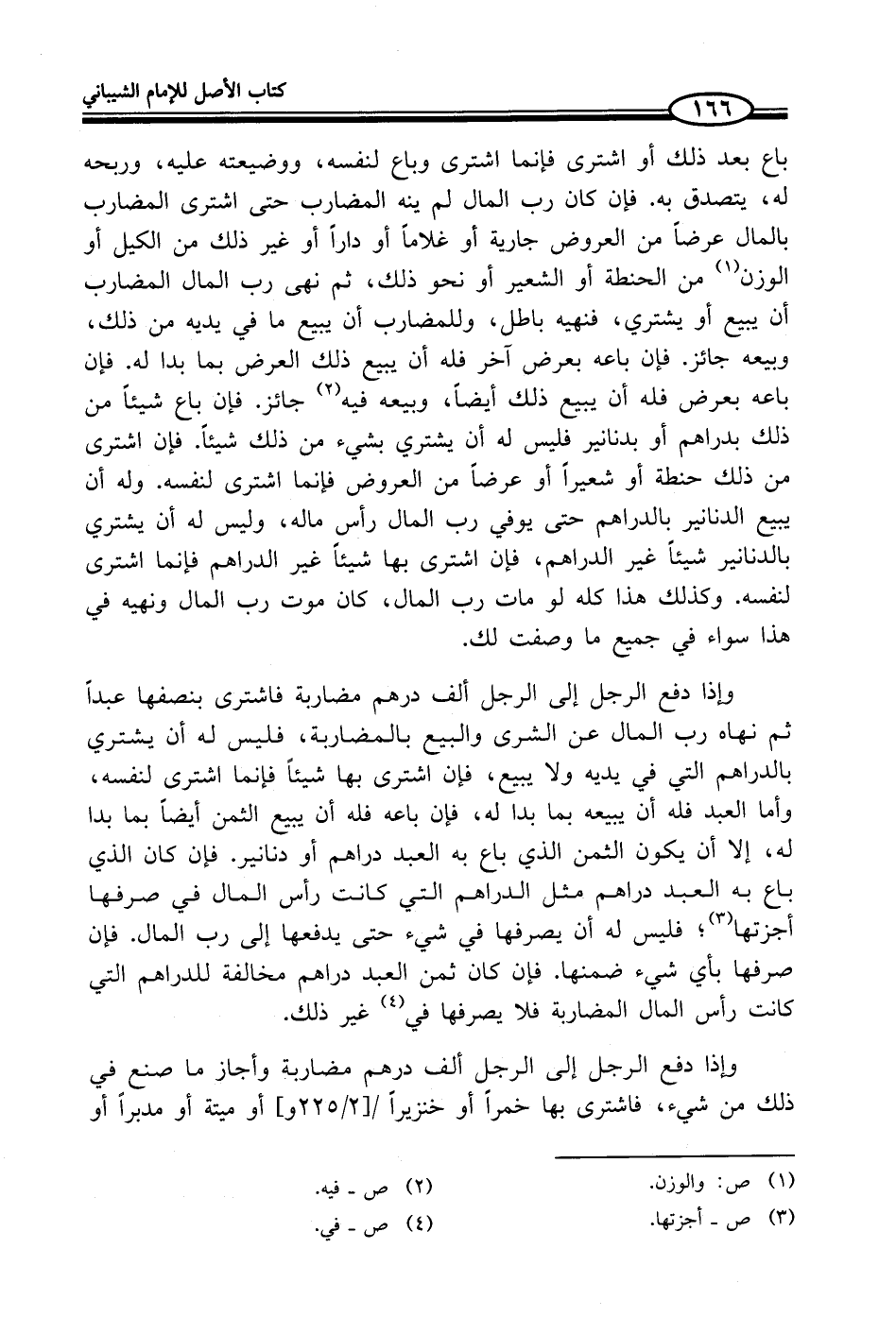 وإذا دفع الرجل إلى الرجل ألف درهم مضاربة فاشترى بنصفها عبداً ثم نهاه رب المال عن الشرى والبيع بالمضاربة، فليس له أن يشتري بالدراهم التي في يديه ولا يبيع، فإن اشترى بها شيئاً فإنما اشترى لنفسه، وأما العبد فله أن يبيعه بما بدا له، فإن باعه فله أن يبيع الثمن أيضاً بما بدا له، إلا أن يكون الثمن الذي باع به العبد دراهم أو دنانير. فإن كان الذي باع به العبد دراهم مثل الدراهم التي كانت رأس المال في صرفها أجزتها (¬3)؛ فليس له أن يصرفها في شيء حتى يدفعها إلى رب المال. فإن صرفها بأي شيء ضمنها. فإن كان ثمن العبد دراهم مخالفة للدراهم التي كانت رأس المال المضاربة فلا يصرفها في (¬4) غير ذلك.