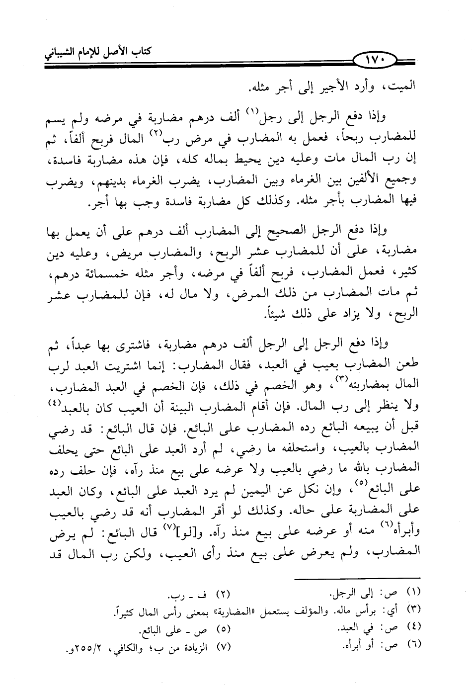 وإذا دفع الرجل إلى الرجل ألف درهم مضاربة، فاشترى بها عبداً، ثم طعن المضارب بعيب في العبد، فقال المضارب: إنما اشتريت العبد لرب المال بمضاربته (¬3)، وهو الخصم في ذلك، فإن الخصم في العبد المضارب، ولا ينظر إلى رب المال. فإن أقام المضارب البينة أن العيب كان بالعبد (¬4) قبل أن يبيعه البائع رده المضارب على البائع. فإن قال البائع: قد رضي المضارب بالعيب، واستحلفه ما رضي، لم أرد العبد على البائع حتى يحلف المضارب بالله ما رضي بالعيب ولا عرضه على بيع منذ رآه، فإن حلف رده على البائع (¬5)، وإن نكل عن اليمين لم يرد العبد على البائع، وكان العبد على المضاربة على حاله. وكذلك لو أقر المضارب أنه قد رضي بالعيب وأبرأه (¬6) منه أو عرضه على بيع منذ رآه. و [لو] (¬7) قال البائع: لم يرض المضارب، ولم يعرض على بيع منذ رأى العيب، ولكن رب المال قد