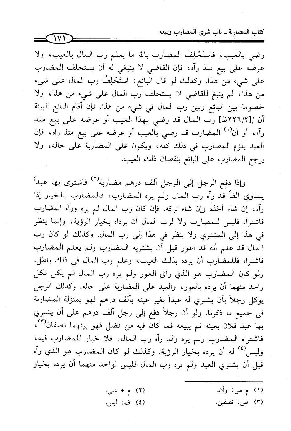 رضي بالعيب، فاستَحْلِفْ المضارب بالله ما يعلم رب المال بالعيب، ولا عرضه على بيع منذ راَه، فإن القاضي لا ينبغي له أن يستحلف المضارب على شيء من هذا. وكذلك لو قال البائع: استَحْلِفْ رب المال على شيء من هذا، لم ينبغ للقاضي أن يستحلف رب المال على شيء من هذا، ولا خصومة بين البائع وبين رب المال في شيء من هذا. فإن أقام البائع البينة أن رب المال قد رضي بهذا العيب أو عرضه على بيع منذ رآه، أو أن (¬1) المضارب قد رضي بالعيب أو عرضه على بيع منذ رآه، فإن العبد يلزم المضارب في ذلك كله، ويكون على المضاربة على حاله، ولا يرجع المضارب على البائع بنقصان ذلك العيب.