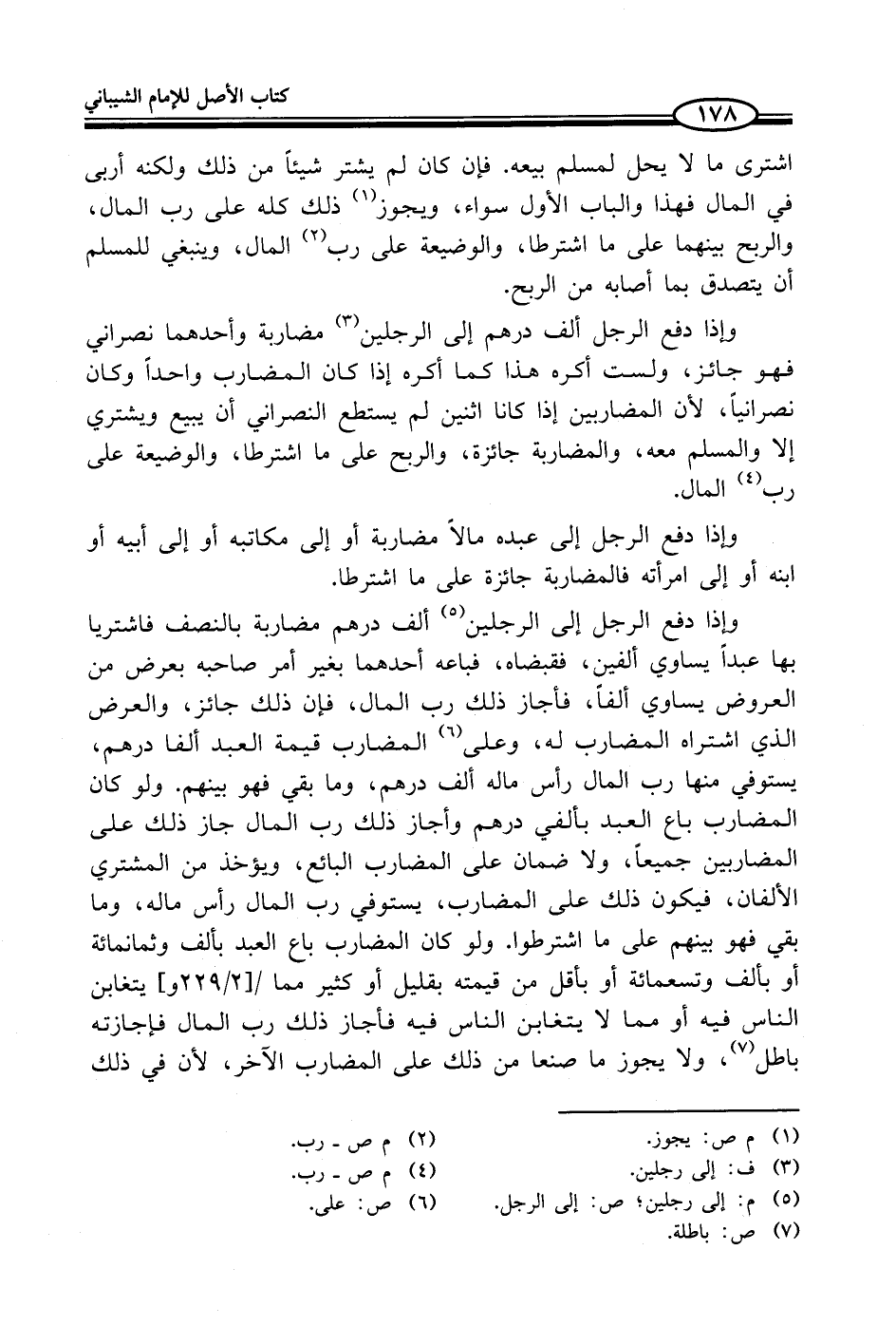 وإذا دفع الرجل ألف درهم إلى الرجلين (¬3) مضاربة وأحدهما نصراني فهو جائز، ولست أكره هذا كما أكره إذا كان المضارب واحداً وكان نصرانياً، لأن المضاربين إذا كانا اثنين لم يستطع النصراني أن يبيع ويشتري إلا والمسلم معه، والمضاربة جائزة، والربح على ما اشترطا، والوضيعة على رب (¬4) المال.