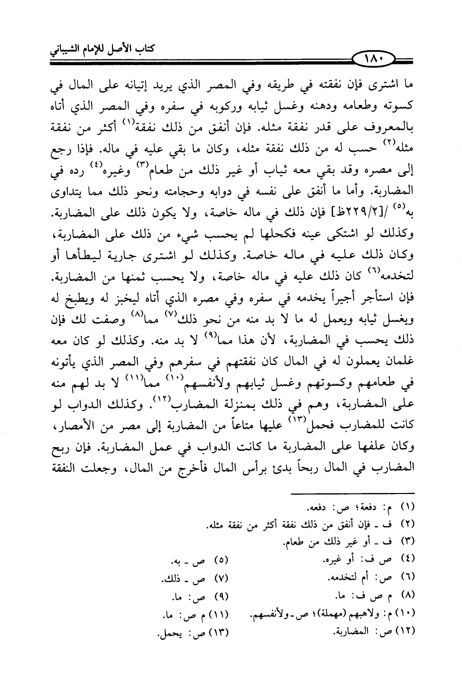 ما اشترى فإن نفقته في طريقه وفي المصر الذي يريد إتيانه على المال في كسوته وطعامه ودهنه وغسل ثيابه وركوبه في سفره وفي المصر الذي أتاه بالمعروف على قدر نفقة مثله. فإن أنفق من ذلك نفقة (¬1) أكثر من نفقة مثله (¬2) حسب له من ذلك نفقة مثله، وكان ما بقي عليه في ماله. فإذا رجع إلى مصره وقد بقي معه ثياب أو غير ذلك من طعام (¬3) وغيره (¬4) رده في المضاربة. وأما ما أنفق على نفسه في دوابه وحجامته ونحو ذلك مما يتداوى به (¬5) فإن ذلك في ماله خاصة، ولا يكون ذلك على المضاربة. وكذلك لو اشتكى عينه فكحلها لم يحسب شيء من ذلك على المضاربة، وكان ذلك عليه في ماله خاصة. وكذلك لو اشترى جارية ليطأها أو لتخدمه (¬6) كان ذلك عليه في ماله خاصة، ولا يحسب ثمنها من المضاربة. فإن استأجر أجيراً يخدمه في سفره وفي مصره الذي أتاه ليخبز له ويطبخ له ويغسل ثيابه ويعمل له ما لا بد منه من نحو ذلك (¬7) مما (¬8) وصفت لك فإن ذلك يحسب في المضاربة، لأن هذا مما (¬9) لا بد منه. وكذلك لو كان معه غلمان يعملون له في المال كان نفقتهم في سفرهم وفي المصر الذي يأتونه في طعامهم وكسوتهم وغسل ثيابهم ولأنفسهم (¬10) مما (¬11) لا بد لهم منه على المضاربة، وهم في ذلك بمنزلة المضارب (¬12). وكذلك الدواب لو كانت للمضارب فحمل (¬13) عليها متاعاً من المضاربة إلى مصر من الأمصار، وكان علفها على المضاربة ما كانت الدواب في عمل المضاربة. فإن ربح المضارب في المال ربحاً بدئ برأس المال فأخرج من المال، وجعلت النفقة